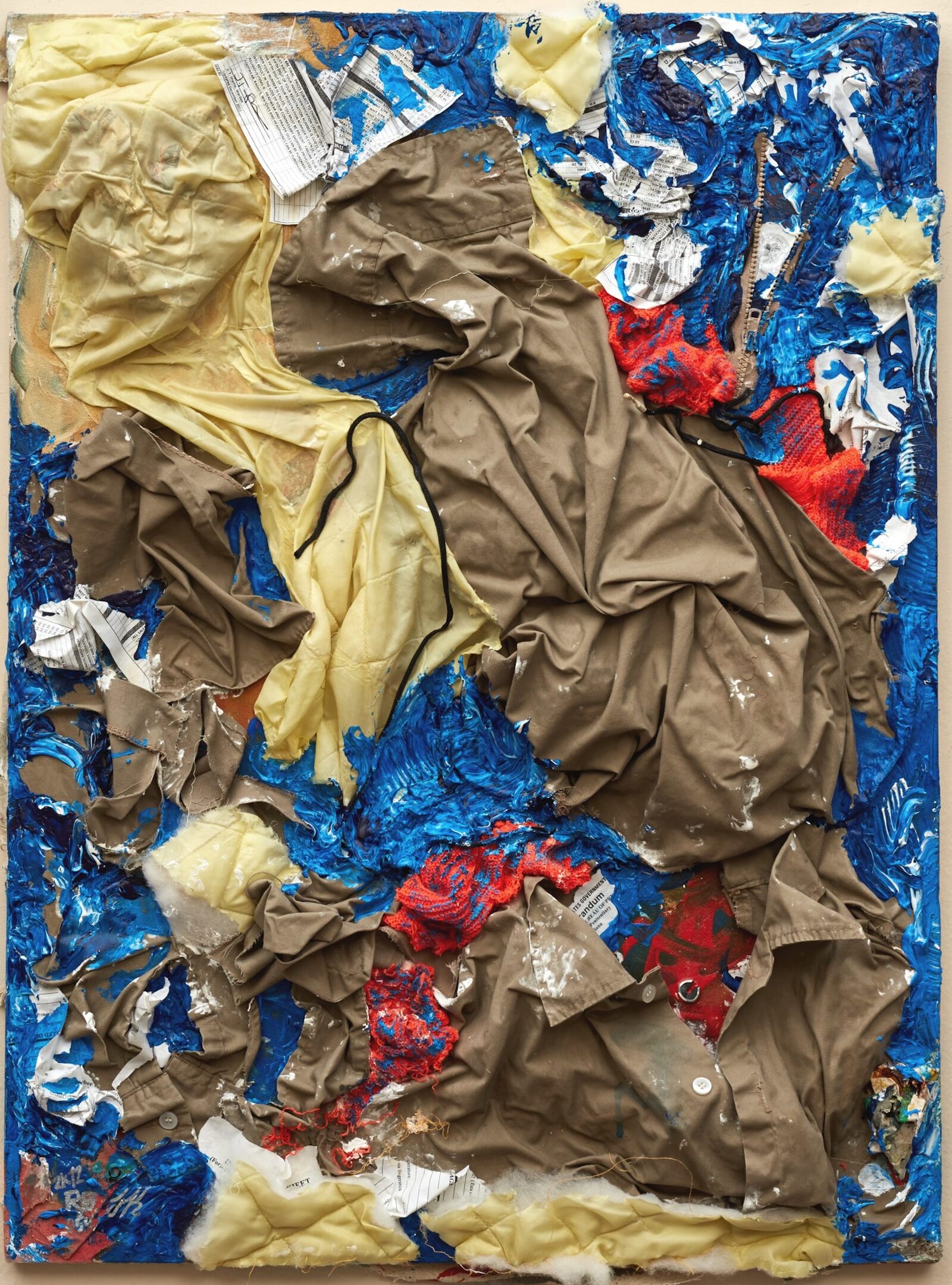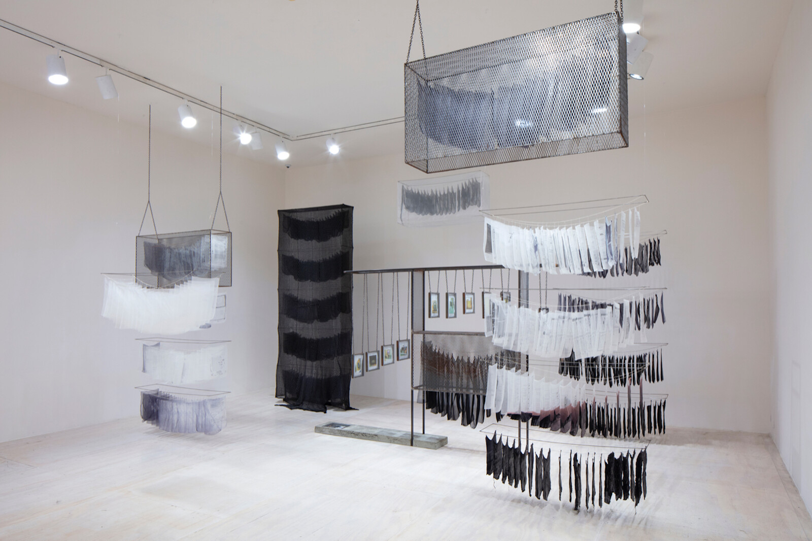 In a nearby gallery is Ellapsium: mer & Helm (2016), a harrowing painting by Jarrod Owens. Its imagery superimposes the plan of New Jersey’s Fairton Prison, in which the artist was once confined, with the stowage diagram of the Brookes slave ship: a logistical blueprint from 1788 on how to pack Black bodies efficiently, in tiered serial form, into a hold. Plumes of blue bleed from the belly of this compound beast, and leak into a misty orange, sea-like background. This binds the work to another painting’s palette and intent: J.M.W. Turner’s The Slave Ship (1840)—which, like the Brookes diagram, was used by abolitionists to convey the horror of the trade.
