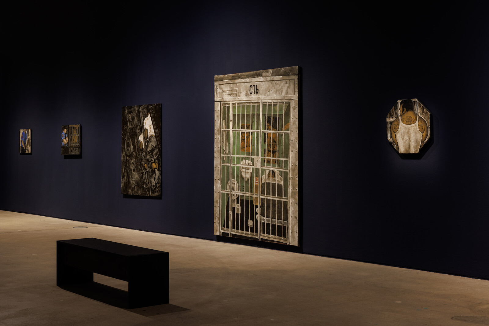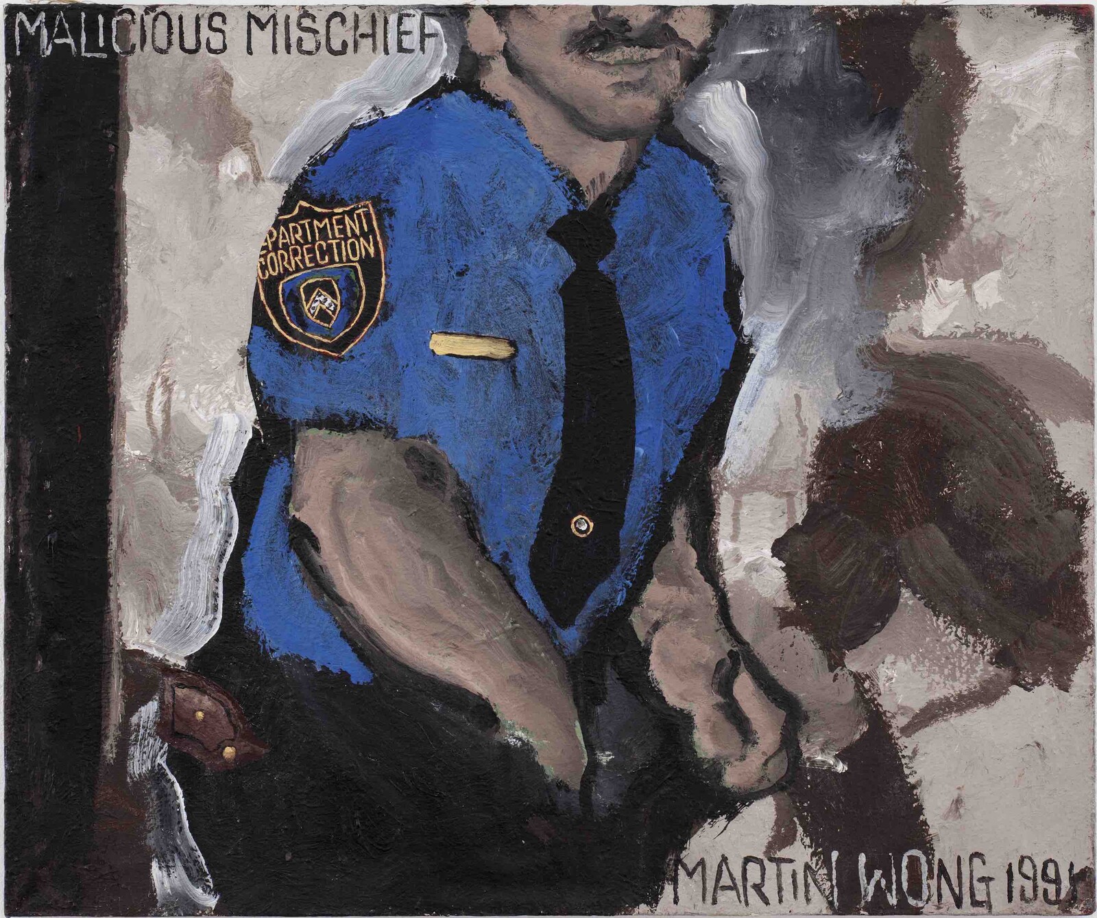 In a delicious flourish, Mi Vida Loca (1991) overlays horniness and gaudiness, as faux-gold ornamentation frames an erect red brick cock, rising from testicles, whose orbic perfection gives the eight ball a run for its money. Wong’s prison scenes roil in claustrophobic, swimming brushstrokes. In the bodies of inmates and in pinup posters, we see moments of loneliness, tenderness, and horniness. For Yau, Wong’s egalitarian politics spoke through his style: self-taught, maniacally detailed, and just to the cartoony side of realism. To believe in the political power of this work is, by logical progression, to assert that art should not only represent those dispossessed by gentrification, but also be a tool of self-articulation. These paintings clearly testify to the beauty of a disappeared world. The question is who, at this moment in time, that testament serves.