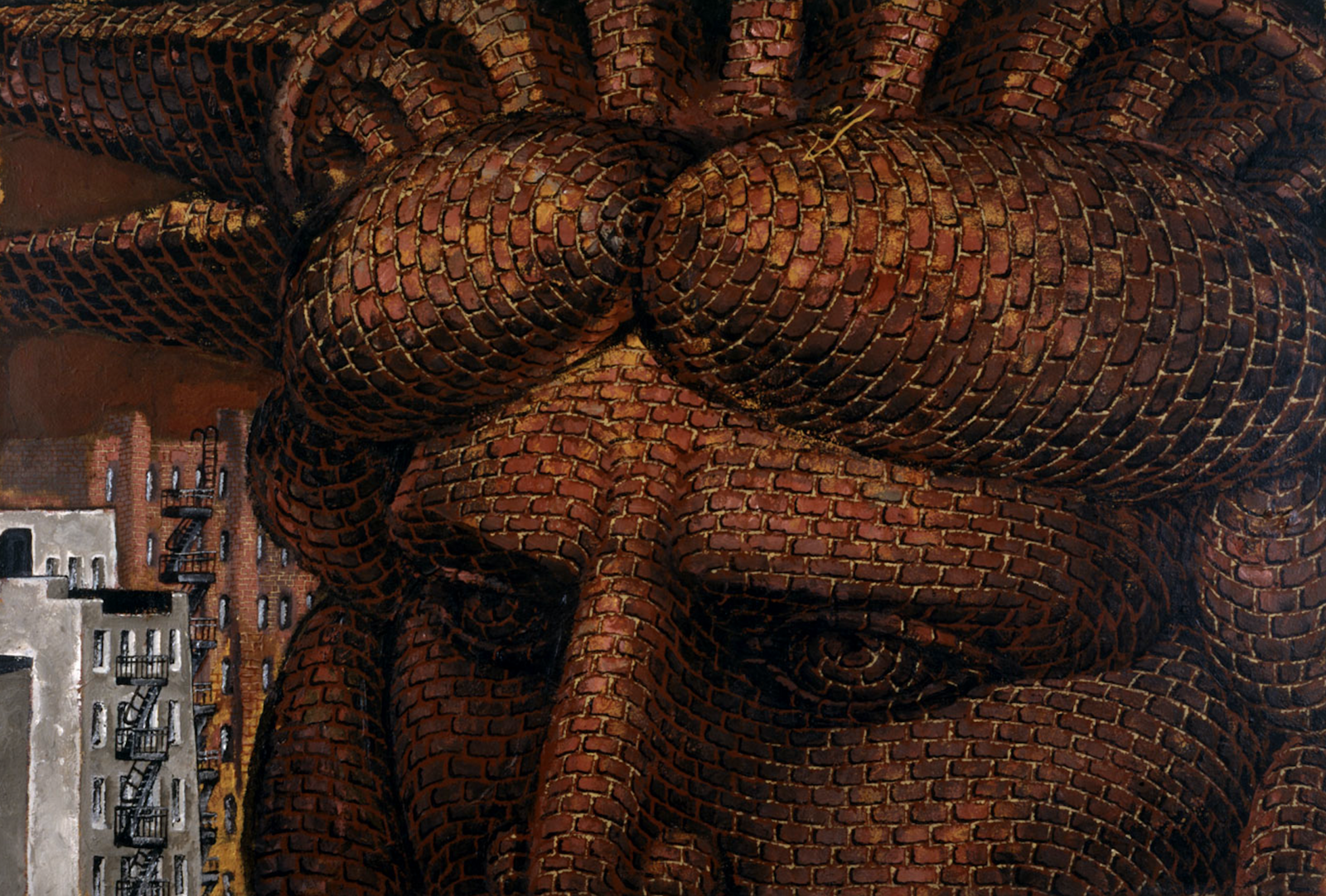 Nocturne at Ridge Street and Stanton (1987) shows an unpeopled but warm cityscape. A sooty brick wall holds the foreground, its windows plugged with cinder blocks. The composition is elsewhere packed with buildings which, leaning slightly and painted in infinitesimal brushstrokes, seem weirdly alive. Meanwhile, cartoon sign language emblems—a signature Wong motif—overlay a constellation in the sky. No Es Lo Que Has Pensado… (It’s Not What You Think…), from 1984, depicts a more explicit tenderness. Two people snuggle at the base of another scarred brick wall, in the hollow lot where another building once stood. The setting is New York, but could just as easily be 1990s Berlin.
