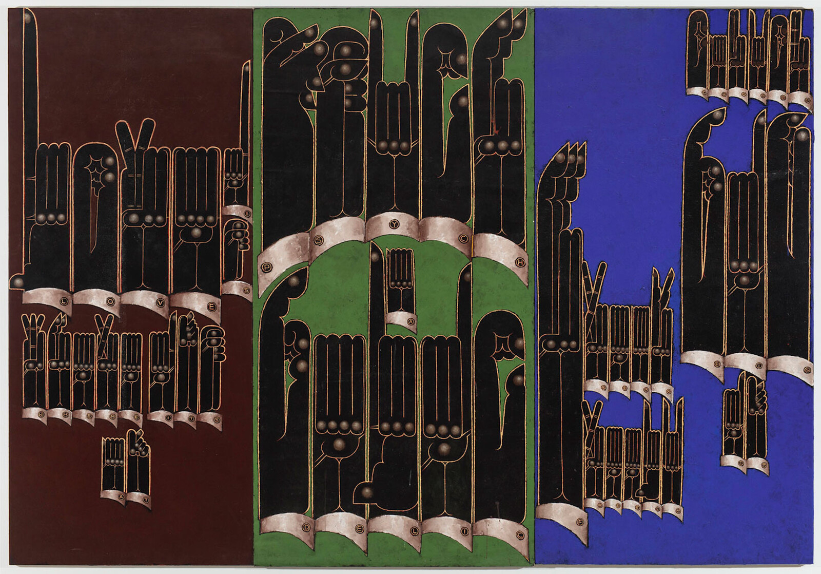 The rule of Wong’s mastery is proved by its exceptions. Weatherby’s (1974) shows a city street at night. Painted in billowy strokes, without cryptic details, surprising compositional tensions, or the supple density that embodies Wong’s best work, the piece stalls in predictable charm. Psychedelic Triptych (1988) is a neat but forgettable merger of graphic design and painting, featuring elongated and arching versions of his sign-language motif.