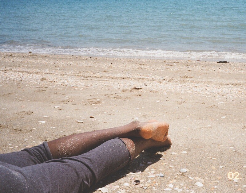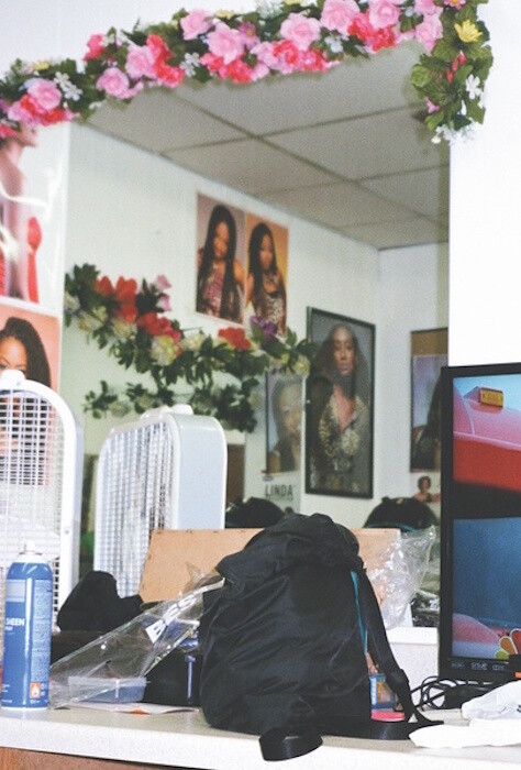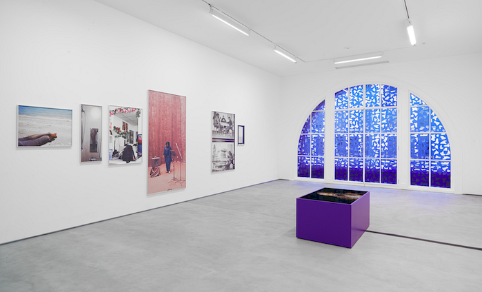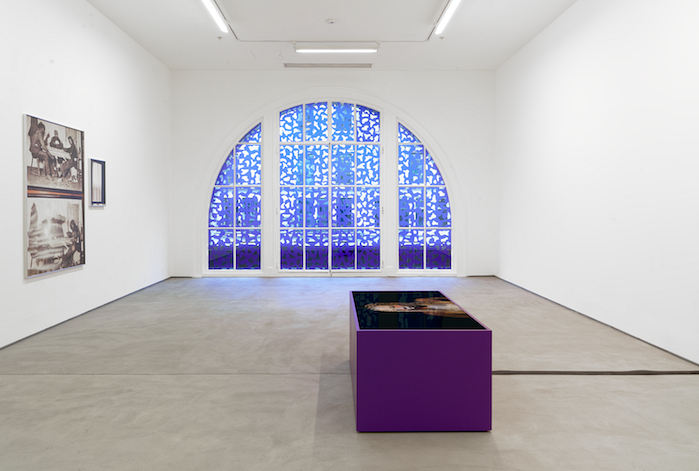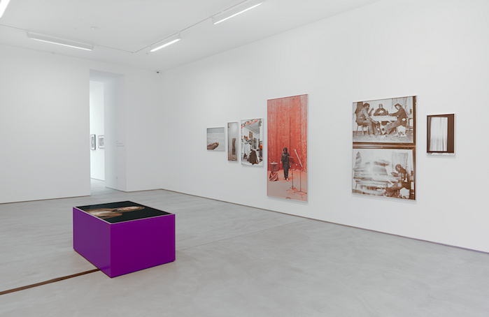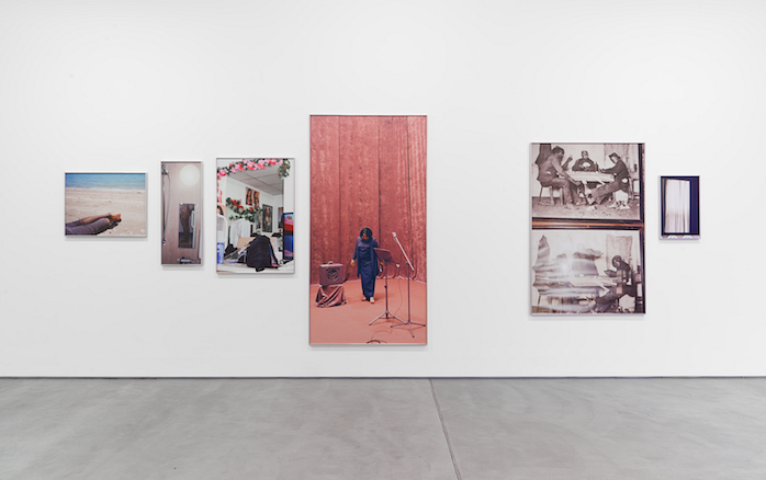 Hung along another wall are six photographic prints. Varying in size and resolution, they resemble a kind of cryptic visual puzzle. Arbitrary framing, an amateur roughness, and contrasting levels of definition give them the distinct feel of found photography; like photos developed from a long-lost roll, the series’ logic seems random, but oddly familiar. Half Sheet (all photographs 2017) sees bare feet on a beach; Insert, a naked, feet-to-midriff, self-portrait taken in a bathroom mirror; 40X60, perhaps a smart phone photo of an archival print featuring antebellum-era African Americans’ playing cards; Three Sheet, a plush recording studio session, where the singer is black and wears black, and stands out against pink drapery and carpet.
