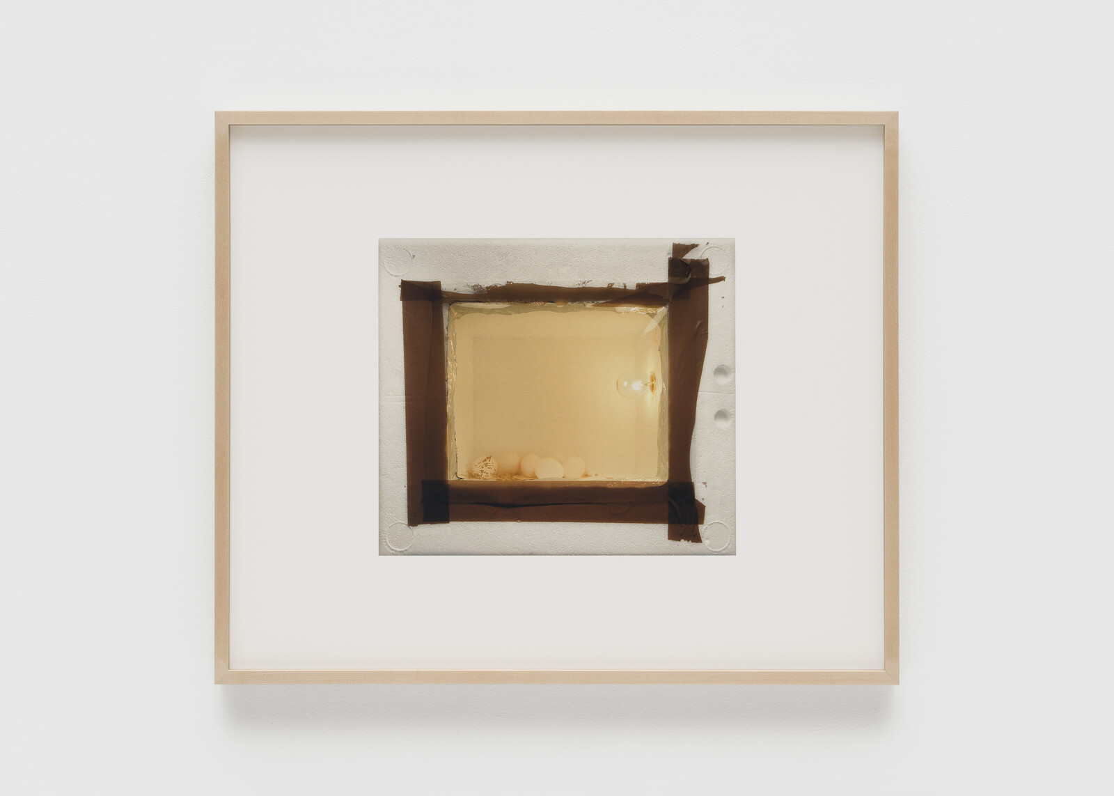 Clark often relinquishes control of the camera’s eye to less authorial modes of image-making: medical probes, a flatbed scanner, eye-tracking software, a motion-triggered trail camera, or Google image search. “Brooder,” a series of six photographs of homemade egg incubators, are about as anonymous as can be—the type of pictures you might find illustrating DIY instructions on a homesteading website. Strangely compelling, they draw out the austere sculptural and architectural qualities of these claustrophobic containers that attempt to simulate natural conditions. With little to no evidence of life, aside from the cluster of eggs in Brooder 4, these artificial nests resemble vacated dioramas, prison cells, or even homespun bombs.