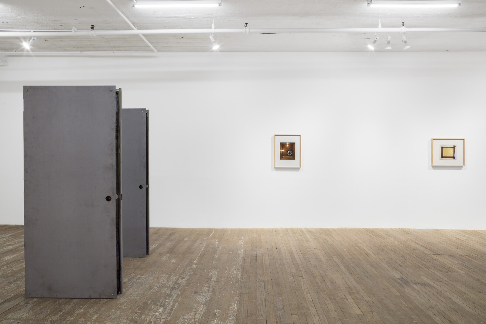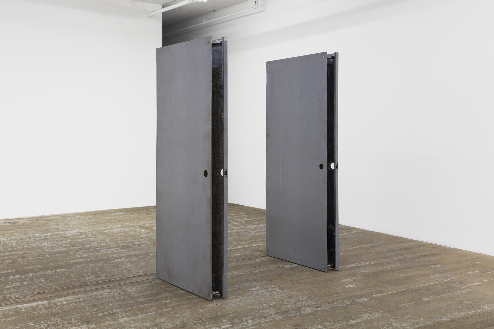 At the beginning of the artist’s 2022 film, Exhibition, the camera slowly scans a grainy black-and-white newspaper photograph of a woman peering through the peepholes of Marcel Duchamp’s Étant donnés (1946–66). Instead of leaning in to look, Clark has us leaning in to listen with Monitors, a freestanding pair of unvarnished, hollowed-out, and reconstructed steel doors. By outfitting the doors with audio transducers, the artist transforms them into speakers that fill the space with chatter and laughter. Closer listening reveals the voices of spectators at a zoo. One deep, unimpressed voice rises above the din: “You’re boring.” It’s unsettling. Unseen and unheard, the observed animals are made present only by the exclamations and comments of passing visitors.