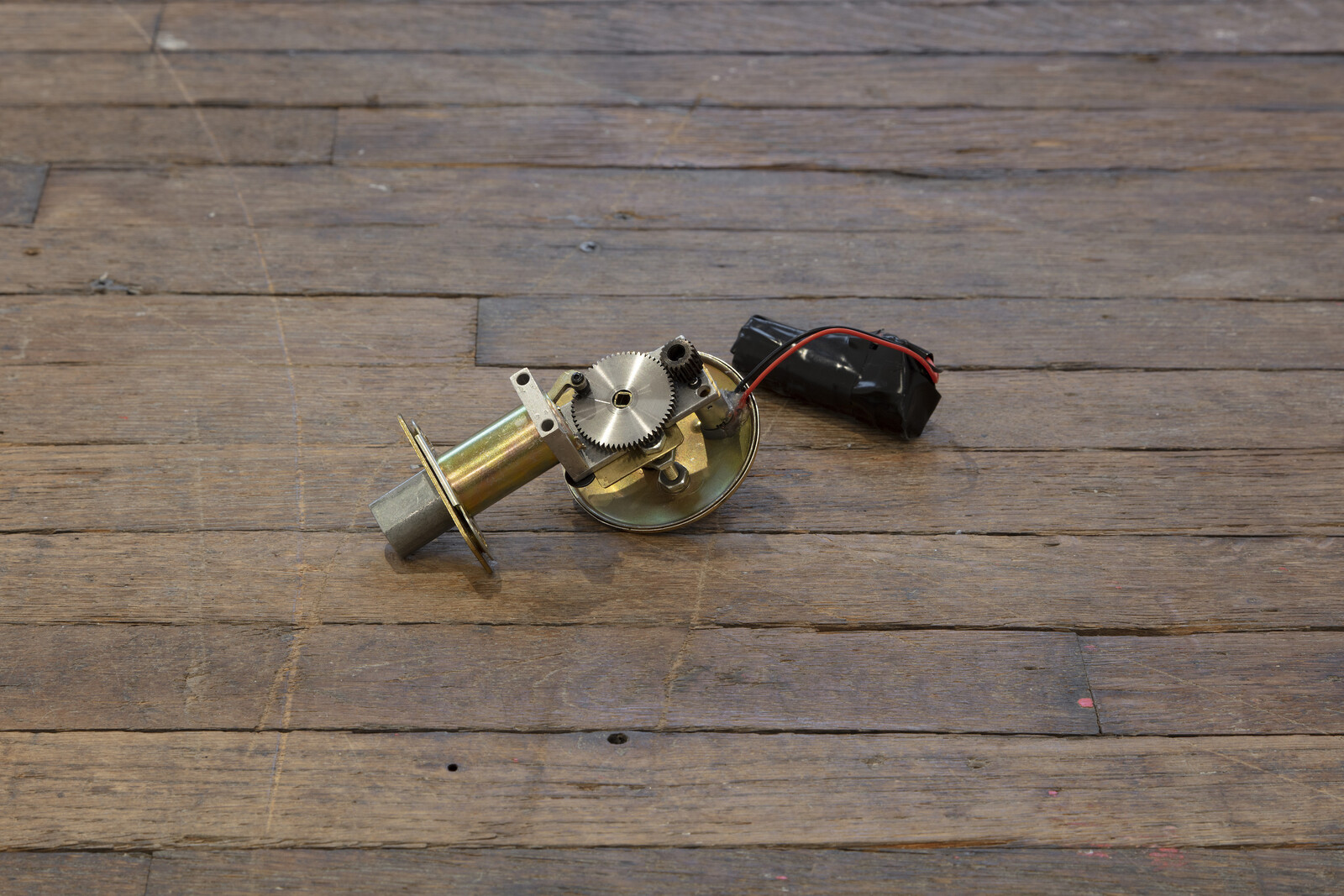 Nearby and underfoot, “Driver,” a trio of motorized deadbolts seemingly released from the doors, awkwardly fumble across the gallery floor. Clark has hacked these barrier-enforcers, turning them into limping mollusks with pulsing tongues that propel them forward as they slide in and out. The locks perform their intended mechanism in a constant, glitchy loop, but without fulfilling their functional duty. This freedom from utility makes them more human or bestial—sad and humorous, but also a bit repulsive.