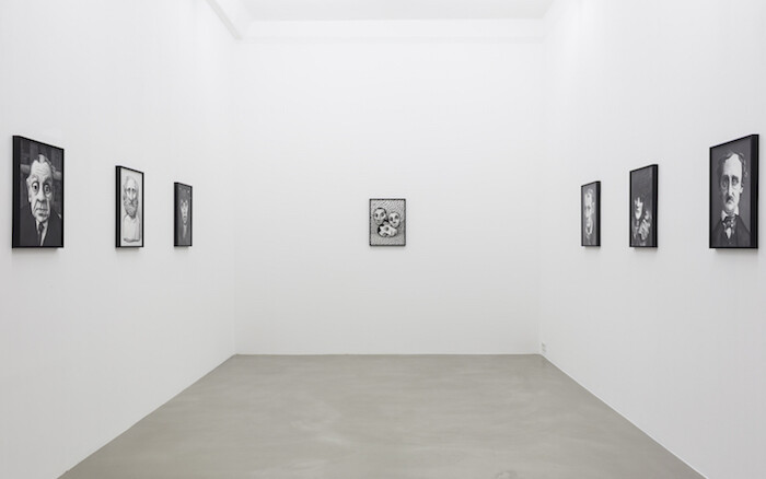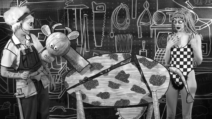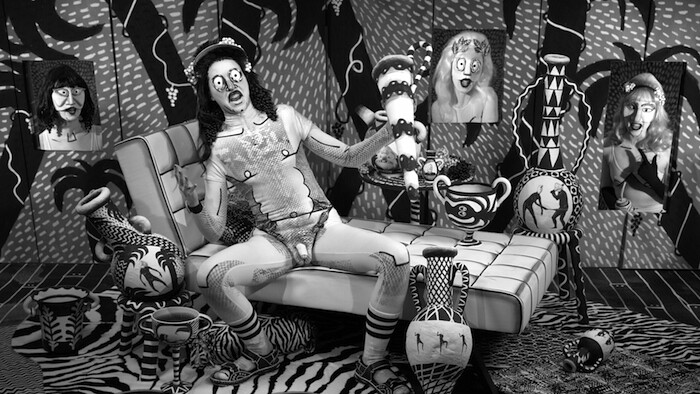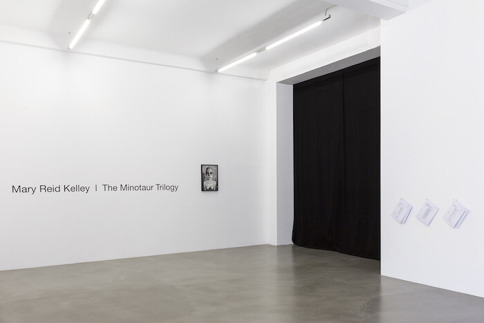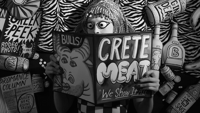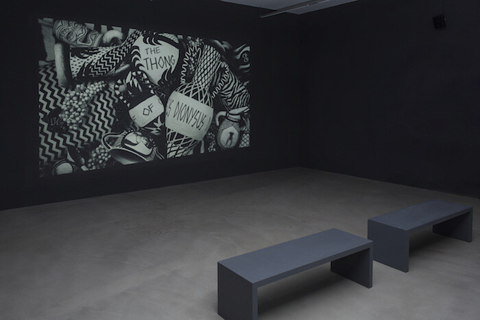 In “The Minotaur Trilogy,” Swinburne’s Pasiphae wears a checkered leotard and Daedalus, dungarees; all characters have cartoonish ball-like eyes, whose deranged gaze seems to pop out of their faces. The queen sports blond Bo Derek-style cornrows, painted cleavage, armpit hair, and bad teeth. Daedalus’ workshop looks like a garden shed; while he saws and hammers, she lies restlessly popping pills and flipping through bovine porn, her ample pubes sprouting out of her bikini line. At Arratia Beer, the space of the gallery is turned into a black box, but for the back room in which a series of ancillary photographs is on display. The trilogy is composed of three separate videos, shown in sequence: Priapus Agonistes (2013), Swinburne’s Pasiphae (2014), and The Thong of Dionysus (2015) with Mary Reid Kelley playing all characters. Reminiscent of German Expressionism, the monochromatic film sets are painted on canvas, in a syncretic blend of camp and queer. The attention to detail is staggering, and all the props have a psychology—they are, in a way, characters, animated by scorn and hysteria. The Minotaur’s father appears as the Osborne Bull, Goddess Venus is a bitch (literally), and the discarded Ariadne, finding “no raisins to live,” attempts suicide with a rubber knife.