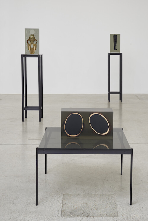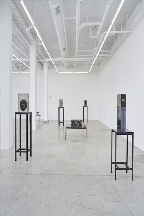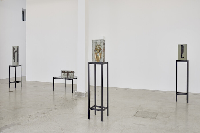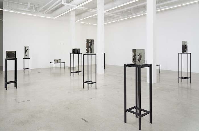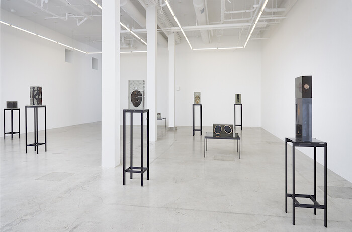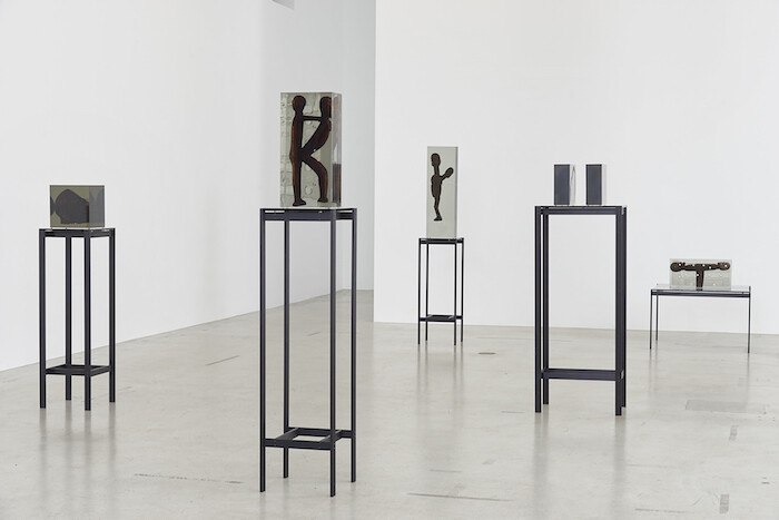 Twelve sculptures of varying heights comprise “Prototypes of Dark Silhouettes” at Jessica Silverman Gallery. Mounted on minimalist pedestals made of anodized aluminum legs and acrylic tops, tinted resin blocks that evoke the translucent geometric forms of the Light and Space movement encase what appear to be African art objects. The figures, heads, and masks are visible through varying levels of opacity, modified by means of patterns carved into the surface of the resin. The press release notes that some of these found wooden sculptures come from the Makonde and Dogon peoples. However, purchased on eBay by the artist, their true origins are murky, emphasized by the literal lack of transparency in the surrounding resin. African artifacts—often generically associated with an entire continent and stripped of their time period—have long been treated as trendy home adornments, and the ritual objects on view here may very well be counterfeits. Authenticity in the age of mass production is elusive.