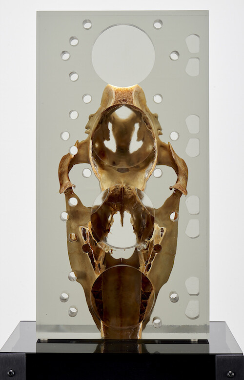 Allusions to industrial manufacturing abound throughout the exhibition, beginning with the title. Until recently, Harrison worked at Ford, creating models of vehicle prototypes. In Dark Silhouette: Zebra Manifold Composition no. 1 (2018), the symmetrical skull of a zebra is suspended in resin as though exposing the skeleton of the work. The word manifold, used in the title, references both the intake and the exhaust manifold of a car and the idea of literal and conceptual layers. For several of the works, Harrison used a CNC router that he built himself to carve patterns borrowed from the Ford factory into the resin blocks. In Dark Silhouette: Seated (2018), holes burrow all the way through the two-headed humanoid wooden sculpture within, creating a connection between this clichéd representation of a generalized African culture and the labor behind car manufacturing that is both direct and porous. This enigmatic form representing traditional African culture is only distantly linked to black Americans, whereas the industrial materials and factory-inspired pattern speak more directly to the history of African American cultural identity in the Detroit area (i.e. Ford was the largest employer of black workers in Detroit in the 1920s and ’30s).
