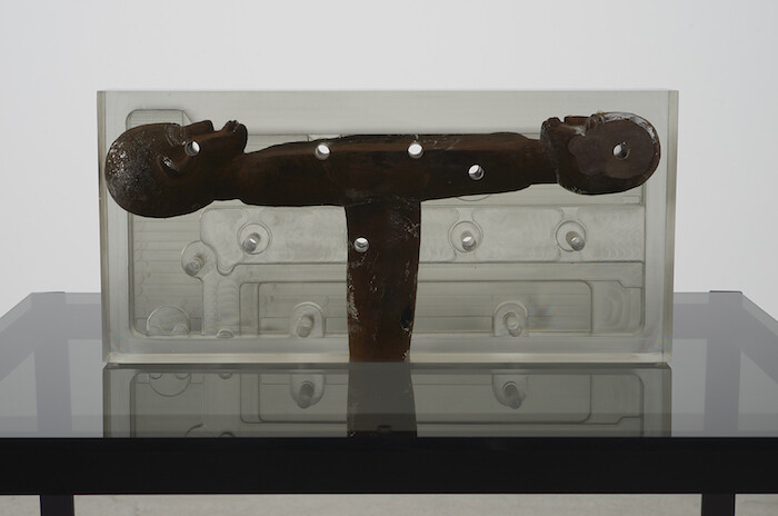 In “Prototypes of Dark Silhouettes,” figurative African sculptures are bifurcated, punctured, turned on their side, and obscured in translucent blocks. The juxtaposition of these manipulated figures and the accompanying pedestals in the style of midcentury modernism evokes the tension between African exoticism and European design, and the resulting works complicate the viewers’ perception. By entangling these organic objects with industrial materials in formal explorations, Harrison suggests a lineage between traditional African wooden sculptures and the recent history of manufacturing in the United States, a trajectory tortuous and fraught.