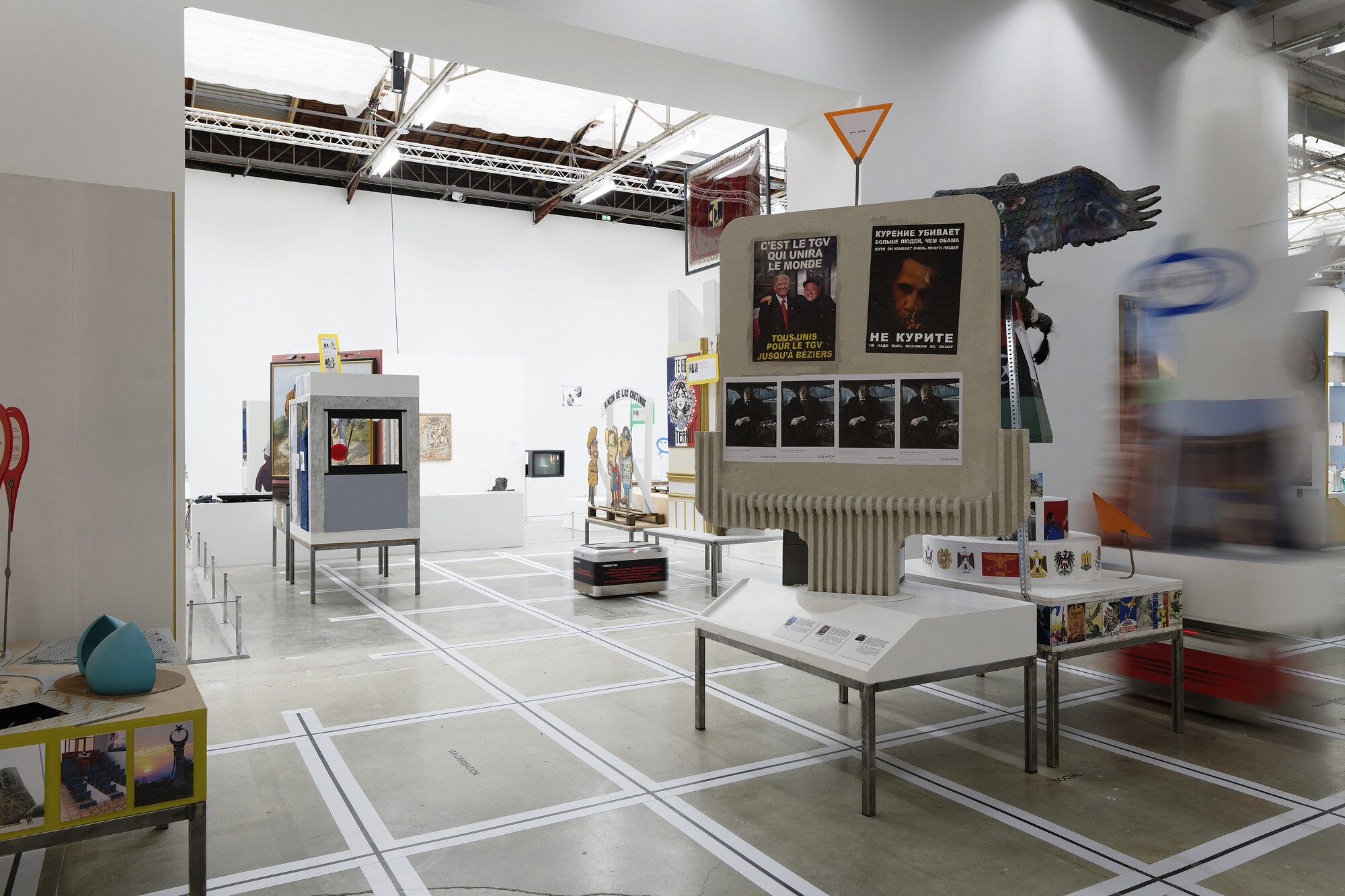 One way to render tangible an imagined universe—through art, writing, or any other medium—is to assemble a set of fragments and then compose them into a system. Bit by bit, over the eight months that followed, my thoughts about Beloufa’s prismatic exhibition led me to other references. A César retrospective at Centre Pompidou, running concurrently to Beloufa’s show, led me to consider the industrial manufacturing processes and materials in the latter’s work; a handful of books picked up at museum gift stores helped to anchor the ensuing essay; and as I thought back to the 2017 exhibition “The Boat is Leaking. The Captain Lied” at the Prada Foundation in Venice, Alexander Kluge’s analytical fictions corresponded, in my mind, with Beloufa’s interest in mediation. I dove into Beloufa’s interviews and watched the videos that he sent to me over email. I sat on trains and read about dystopia, liquid modernity, and the politics of display and production in contemporary art.