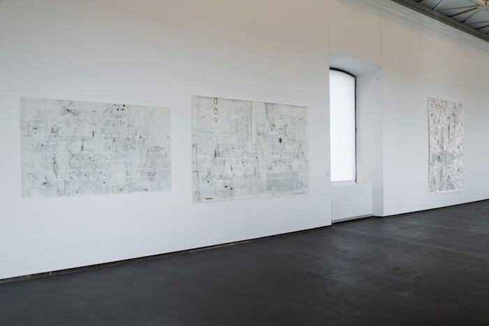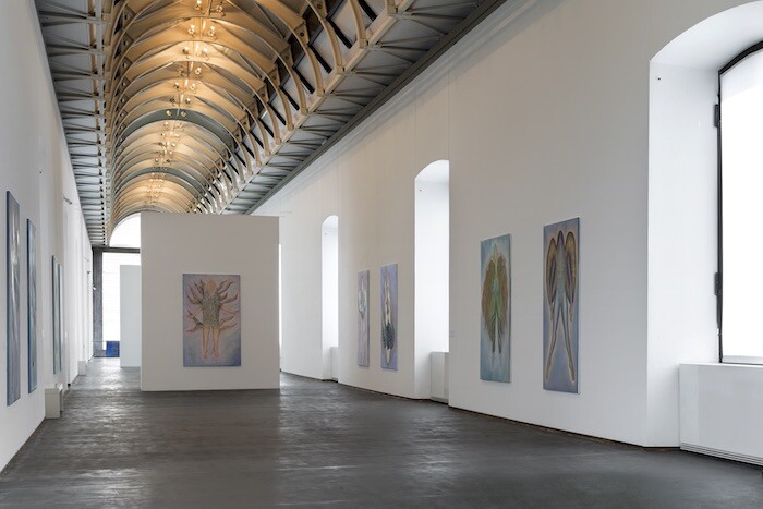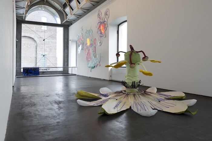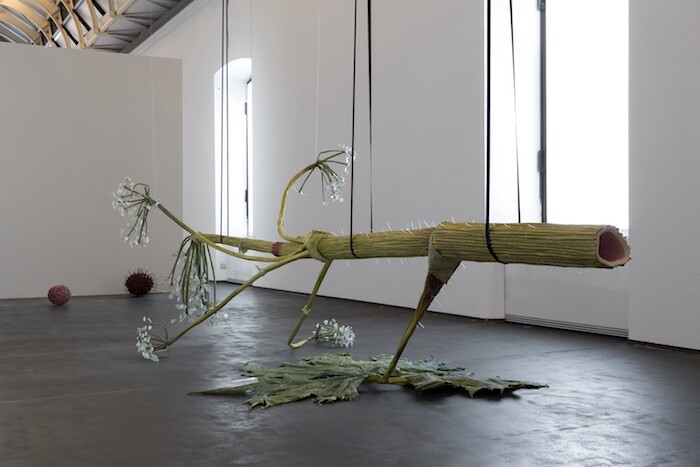 Hypotheticals aside, visitors to the exhibition are first met by a giant flower displayed on the floor. Ingela Ihrman’s The Passion Flower (2017), a mixed-media sculpture, is grossly over scale; its petals lie flush against ground to reveal its ovary, stigma, tendrils, and other interior bits. As a genus, the passion flower hosts vast morphological variations across several hundred species and has divergent medical and culinary uses, as well as common names and associations, from resembling Christ on the cross to the face of a clock. Towering over this suggestive specimen is the gallery itself: a very long, very tall hall, which has the proportions of an extremely pinched cathedral only a few meters wide. This setting forces the show to conform to a highly formal procession, which seems contradictory to any idea of being against fixity even though the exhibition didactics call for a return to pre-Socratic modes of thinking about nature as being in a state of flux and not a division of labor or type.