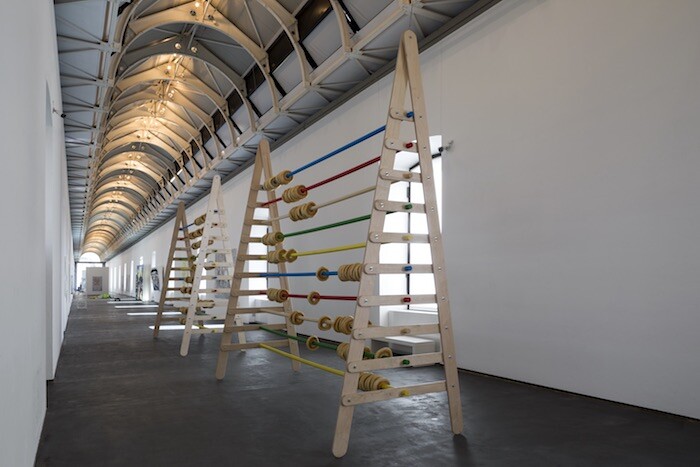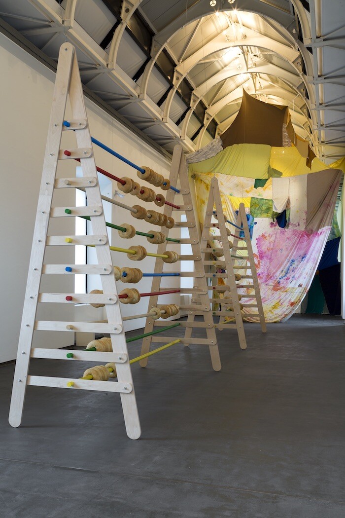 Martinez has dotted several other floral pieces by Ihrman down the center of this axis, while presentations by other artists, predominantly bracketed as zones that afford each artist their own territory, line the side walls. There is variation to this pattern: Ihrman’s works give way to Celestial Numbers (2018), two four-meter high wooden abacuses bearing bread beads by the artist Eduardo Navarro that take over the central spine, and are backed by Reto Pulfer’s Theaceaes Traum [Theaceae’s Dream] (2008–18), a series of dyed curtains hung to divide the far end of gallery laterally by forming a set of interstitial spaces to traverse.
