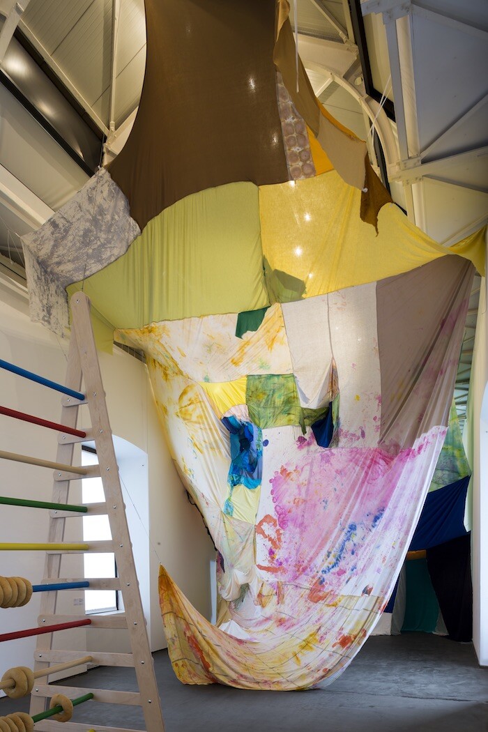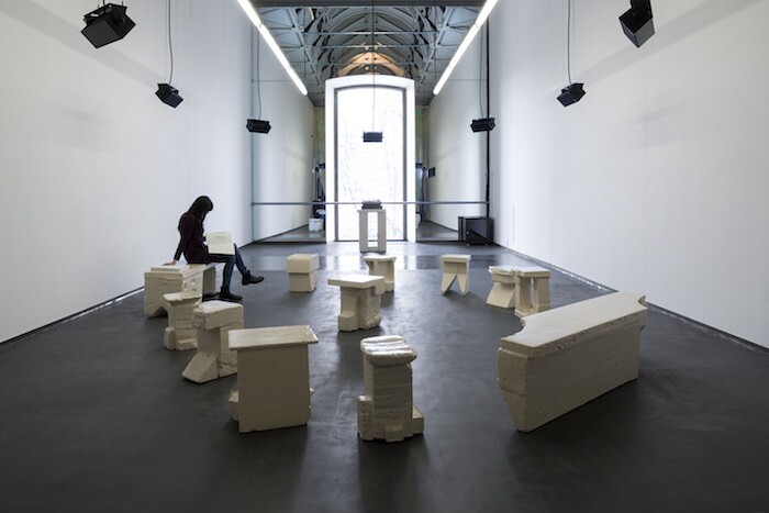 Theaceae are a family of flowering shrubs including the camellia. The use of the possessive in Pulfer’s title, however, makes a near-homophonic pun with Theseus, the mythological king. When considered with the sail-like elements in the installation, it brings to mind the ship of Theseus, a classic paradox in the metaphysical study of identity that asks whether a ship is still the same ship if each and every part of it were exchanged for a new part. Other references abound: the frontmost fabric is patterned to resemble a face wherein the mouth is formed by a tent-like opening to crawl through on all fours. Coupled with the scent of Navarro’s bread beads, the sensation of being eaten is matched by the childlike feeling of playing in an elaborate blanket fort while being devoured and ingested, or even birthed. After passing through the viscerally colored inner sheets, visitors arrive at a hidden last work, finding themselves in a ring of seats resembling a miniature Stonehenge. Here, they can listen to a collection of texts by various authors on the subject of displacement, scored in the Albanian iso-polyphonic style, a drone-like chant. Entitled I Have Left You the Mountain (2016), this project by Simon Battisti, Leah Whitman-Salkin, and Åbäke could have capped the exhibition had visitors not been forced to turn around and view the entire show in reverse before exiting. This shift produces a kind of liminality in which the order of things is put on its head, broken time and again by the recombinant exhibition plan.