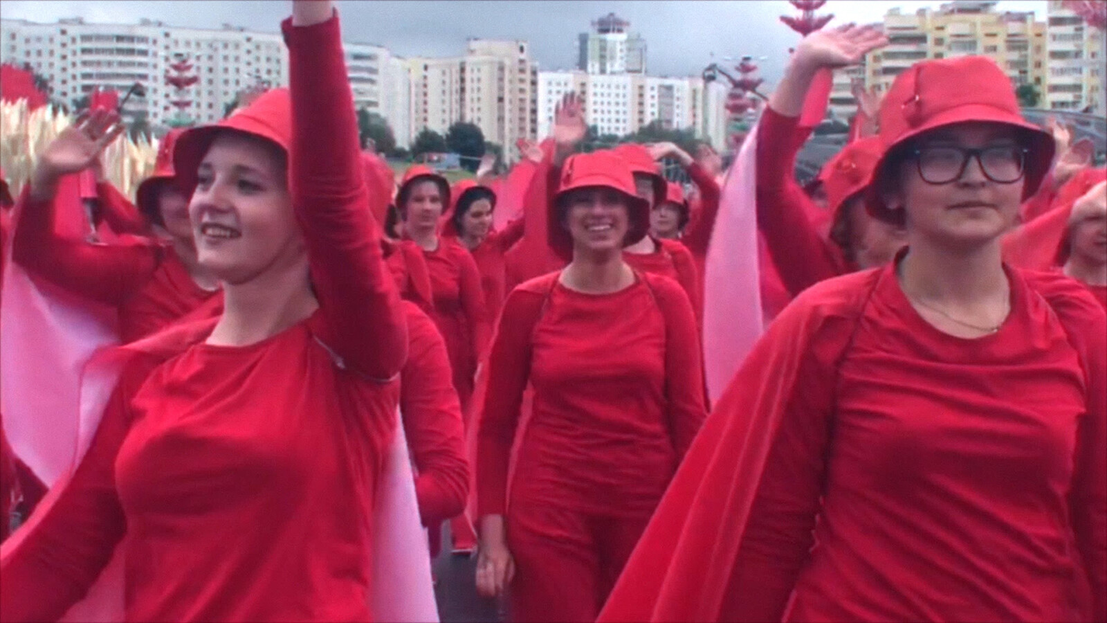 Paulina Olowska’s subtle and beguiling Univermag GUM, comprising four episodes subtitled Parade, Winter, GUM, and Airport (2018) resembles the sort of mid-1990s/early 2000s state-produced documercial one might have seen on European in-flight entertainment. Shot at the Minsk location of the department store GUM, a relic of the Soviet era, the film captures the softcore, low-budget aesthetic of state propaganda promising a vague new future. Olowska’s film is imbued with nostalgia alongside its picture of the present: the film’s idealized image of “woman” is halfway between a uniformed, independent airport worker and an aestheticized, luxury-clad bourgeoise caught shopping for short skirts and make-up. The film’s tone is ironic and celebratory, mixing frequent slow-motion shots of women with cuts to state architecture, parades, fireworks, and figurative public art exuding a steadfast, heroic air.