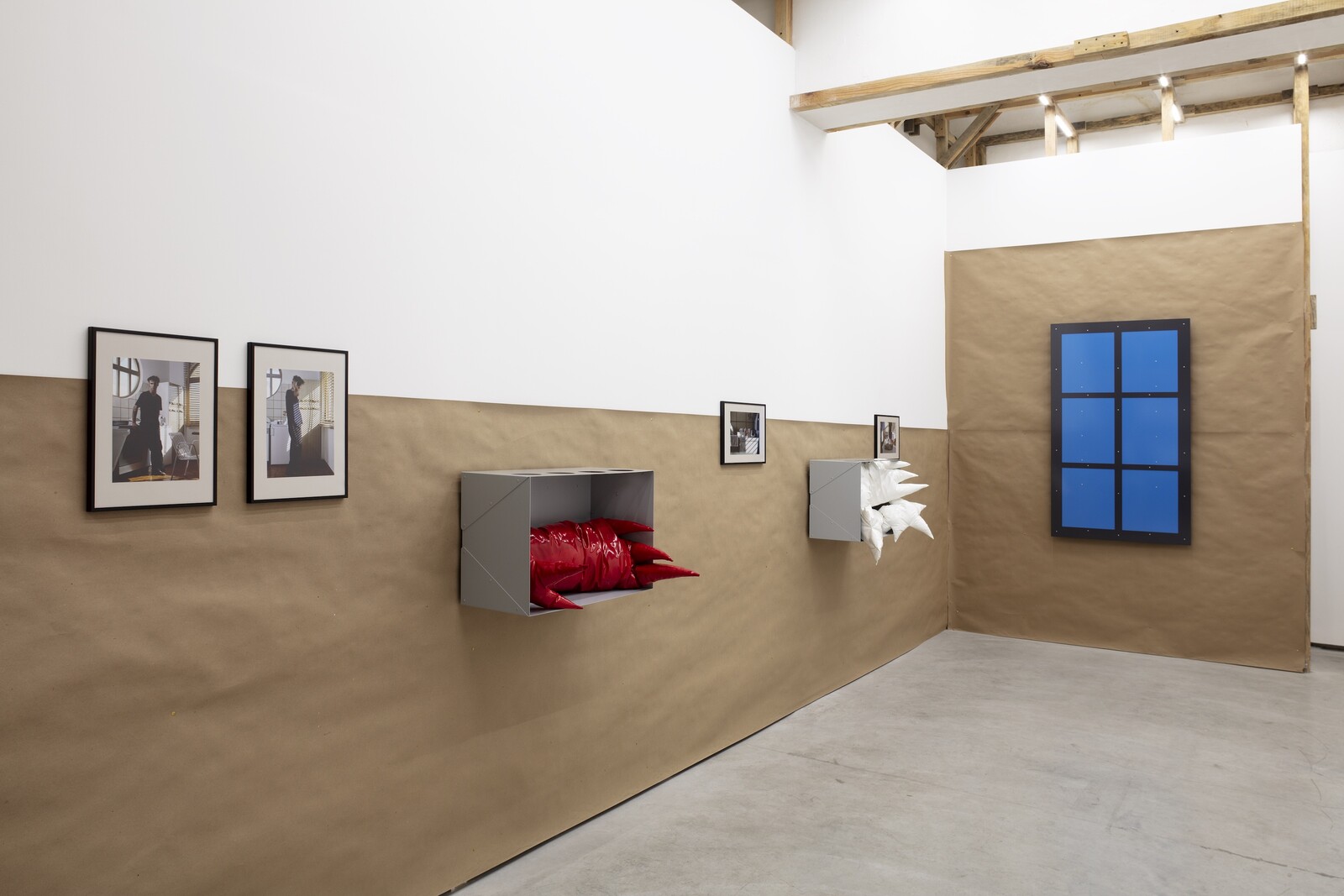 In the images, a young man stands around in a domestic interior, a sunny kitchen somewhere in Southern Europe. In the first two he is alone: looking over the photographer’s shoulder with a fashionable pout in one, staring out a window in the other. The second pair shows only close-ups, a sugar bowl and a cup resting on a washing machine, the torsos of people standing around a table, a pair of hands. These images are interpolated with a few enigmatic objects, like a minimalist fake window made out of aluminum and steel (Window, 2022), the literal superposition of a blue sheet with a black grid on top. Or the evocative juxtapositions of Comet in a box (2022) and Comets in a box (2022). Both almost as simple as they sound, these standard aluminum boxes are stuffed with rudimentary comet shapes made out of shiny red and white vinyl fabric. That these equally mythical and modest objects coexist with the reasonable, predictable interiors of the images only emphasizes the idea of existing in an imaginary place: the kind of fiction, in other words, that a theatrical set supports.