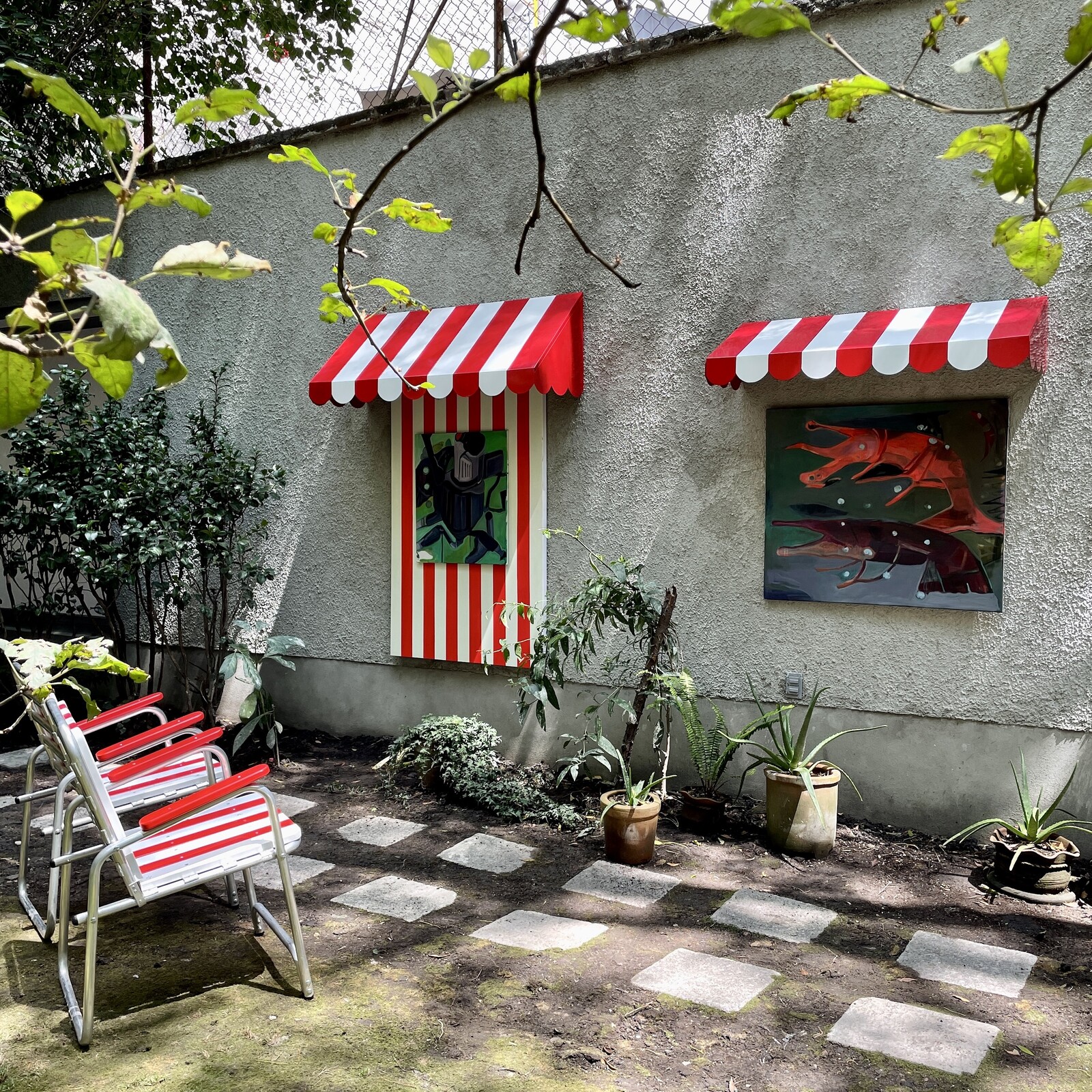 At House of Gaga, Alex Hubbard’s art objects are similarly put to work, but in a more relaxed manner. They imitate the aesthetics of marisquerías, the loudly decorated seafood restaurants found all over Mexico. One can hear the salsa and smell the michelada when looking at his loosely delineated, brightly colored paintings of lobsters and beers (Exotic Parameters, 2022), and swimming shrimp (Garden Painting I [Tandem], 2022). They hang outdoors at Gaga’s private garden, barely protected by candy-striped awnings left over from the city’s freakishly long rainy season, which only recently ended.