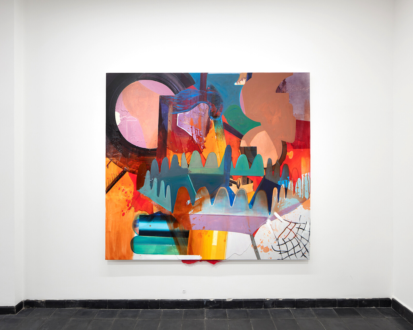 Two similarly striped folding chairs sit in front of each painting, a little out of touch with the gray skies we’ve endured. The leisurely painting installations also contrast strongly with their counterparts inside the gallery, where five enormous, abstract expressionist paintings hang. Where the garden group evokes the fantastic domesticity of a vacation; the inside group is all dismembered mechanics, its colors toxic-spillage bright, its edges ragged with hardened latex, the transparency on the layers improbable, artificial. If these paintings are at work, it seems they are aware of—and enjoying—their oppression. The theatrical, comparative framing of both groups of paintings provide an ironic commentary on spectatorship, instead of merely suffocating the art. A highlight is Disturbia (2022), centering the open jaws of a machine in fumes of noxious teals and browns against a fiery orange background, which features pretty reflections of metal pipes—and some ominous blood stains and cobwebs, for good measure. Hubbard’s paintings exert themselves, even when pretending to relax.