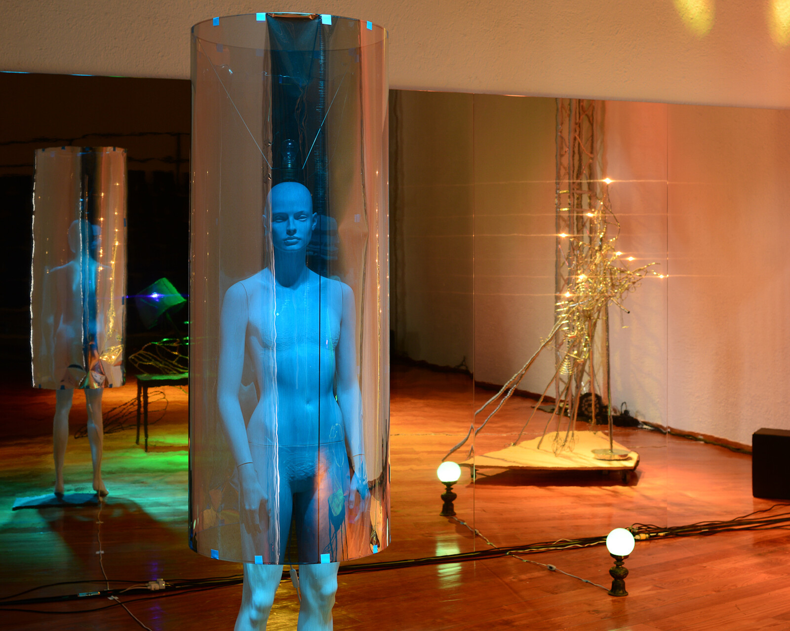 The show incorporates all of these, yet its elaborate yet haphazard staging renders the artist-curator’s intentions opaque. Further inside the gallery is a makeshift auditorium: a staggered seating area on one side and a stage framed by the steel beams of lighting rigs on the other, with mirrored panels at the back of the stage. This stage is populated by a few sculptures by some well-known artists. Untitled (2010), a white, nude mannequin trapped inside an iridescent cylinder is the work of Heimo Zobernig; Dark Table with Light (2007), a monochromatic assemblage of a floor lamp tilted on a table with butterfly wings, is by Tunga; and a small, delicate piece in brass and translucent fabric, La rivoluzione dogmatica (1969) by Fausto Melotti, sits just behind a wall, inconspicuous under dark blue light. The objects appear neglected, awaiting some kind of incantation to re-animate them. This feeling heightens the sense that a stage is a far-from-ideal environment for appreciating art. The dim surroundings mean the works are hard to read, while the laugh tracks, fake claps, and harsh illumination of theater lights intensify the sense that these works are being upstaged. They can’t catch a break. I quickly realize I’m missing something (if not everything) by not attending the “activating monologue” events. But is it too much to ask for the objects to do some telling of their own?