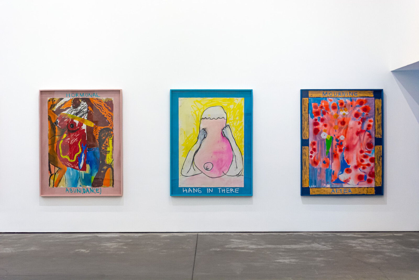 Perhaps partly in anticipation of the cancellation of Art Basel Hong Kong, a surplus of American and European dealers and collectors were present during this major week of art fairs, gallery openings, and museum exhibitions. Pia Camil’s exhibition “Ríe ahora, llora después” [Laugh Now, Cry Later] was particularly popular with both visitors and locals. For her second solo show at Galería OMR, the Mexican artist showcased a suite of large-scale drawings—often featuring female figures and ghoulish faces—made with acrylic ink, oil pastel, and watercolor. These tableaux are droll, expressive, and overtly autobiographical. One piece features a long, billowing face, hands over its eyes, chin resting on a table in desperation, with the terse phrase “hang in there” drawn onto the canvas’s edge. In another, a nude female torso is framed by the words “hormone abun(dance).”
