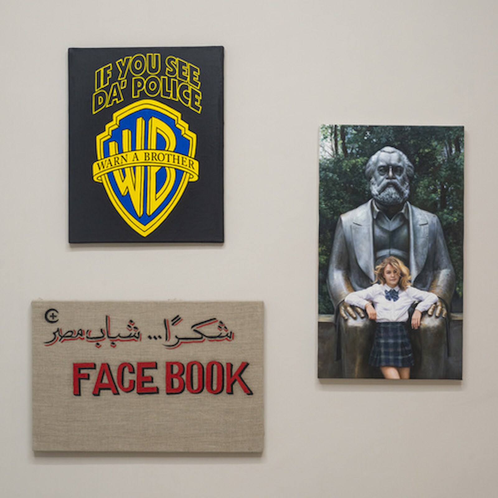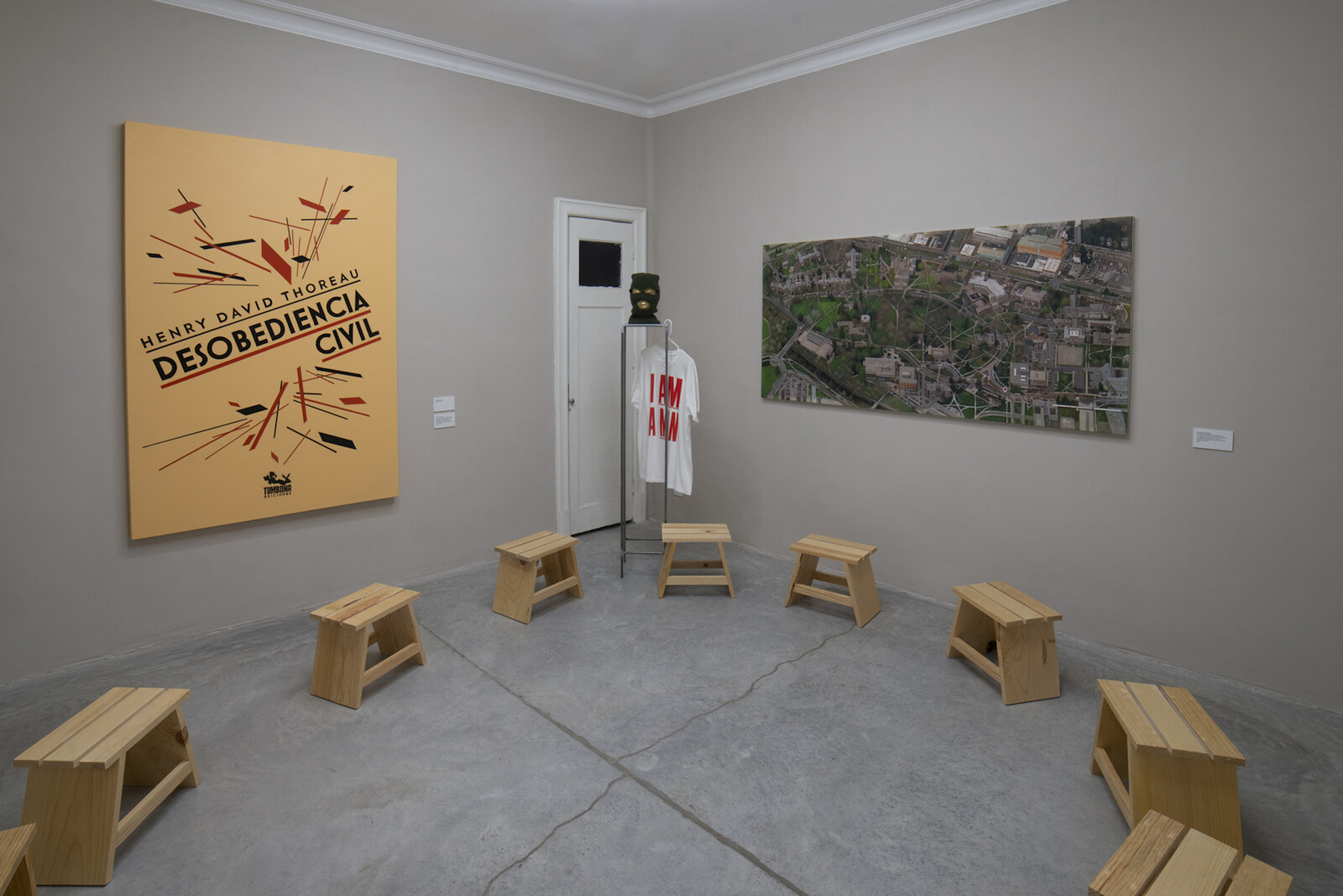 The title of Jim Ricks’s painting, I’m So Bored with the U.S.A. (2019)—borrowed from the Clash song—might be taken as a comment on how pervasively Mexico City’s Art Week has, in recent years, been dominated by the country’s relationship with its northern neighbor. This teal-colored canvas, the text of its title painted neatly against the surface in a sans-serif font, hangs at Daniela Elbahara gallery among a collection of the artist’s playful and witty works interrogating the structures of democracy and resistance. “This is What Democracy Looks Like” is the first painting show for the US-born Irish artist, whose conceptual work often incorporates sculpture and performance. The exhibition uses humor to lay bare the absurdity and hypocrisy of US politics, and to question the amount of attention paid to the country by the rest of the world.