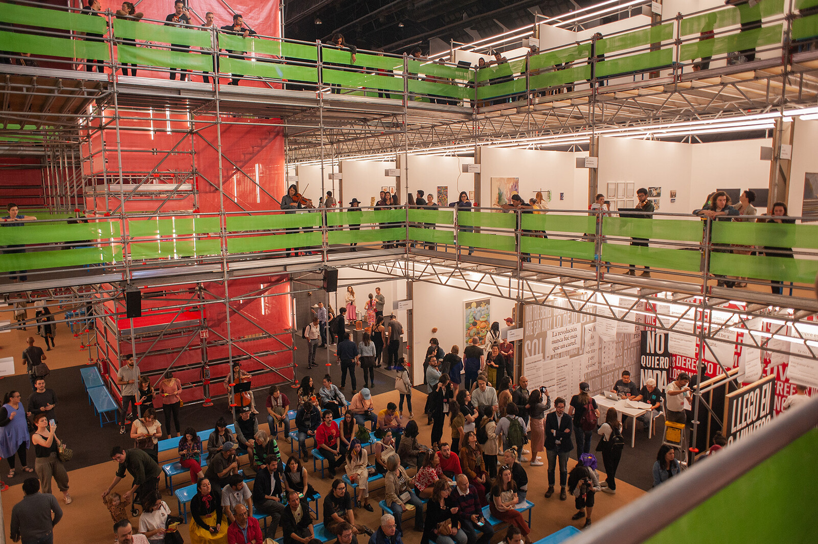Material Art Fair, celebrating its seventh edition at the Frontón México, a Jai Alai arena, felt for the first time a little too ostentatious. BMW, now one of the fair’s major sponsors, proudly displayed its new 2020 M8 Competition coupe in the main lobby, while many blue-chip galleries made their debut appearances. In contrast, Salon Acme, housed in the Juarez district’s iconic dilapidated mansions, remained bewitching in its eighth edition. With its maze-like venue, the fair was able to showcase more intimate works, such as Enrique López Llamas’s ¿Qué es lo que se espera del arte mexicano? [What Is Expected of Mexican Art?] (2020), a text-based artwork made from discarded books about the history of Mexico. The expansive space also lent itself well to the display of monumental pieces, among them Pablo Davila’s But The Subject Is a Long One (2020), a series of neon light rings reproducing a letter by Oscar Wilde. The large-scale chandelier hung prominently from the main courtyard’s ceiling, a luminous display razzing on Wilde’s notion that “art is useless.”