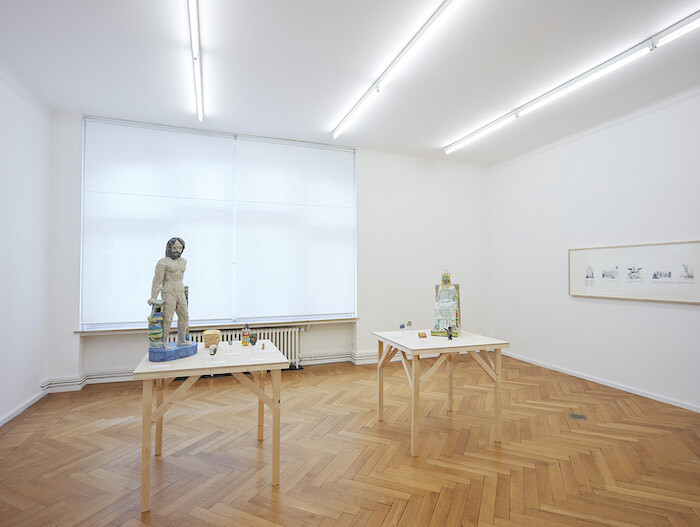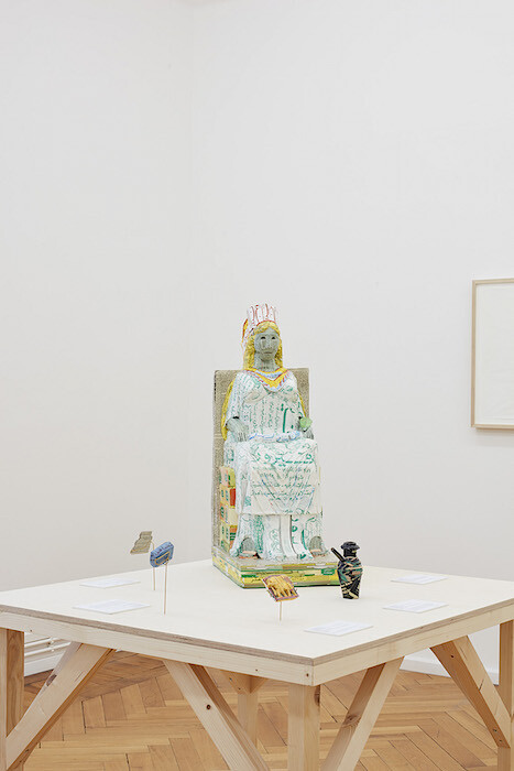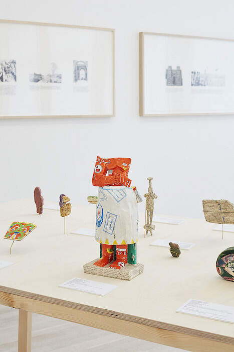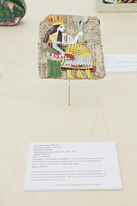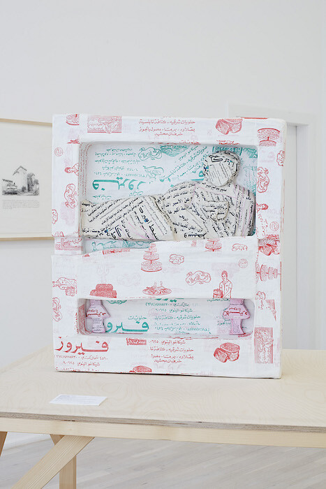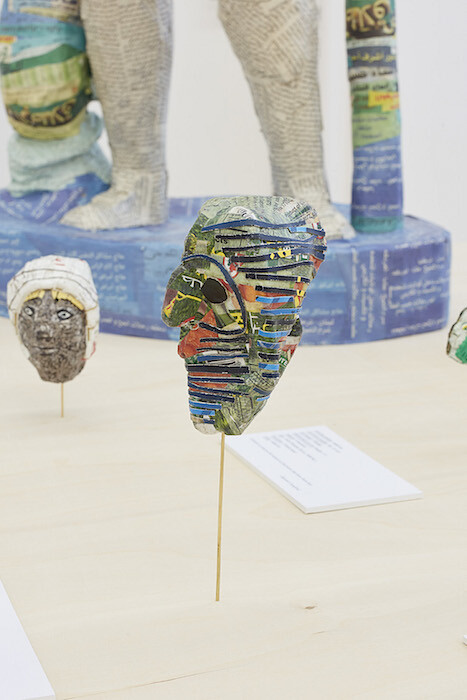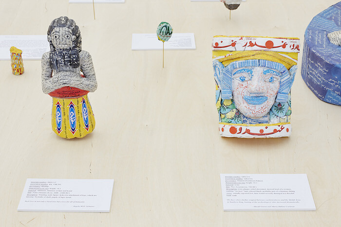 In 2010 the artist, whose mother’s family fled Iraq in 1946, exhibited a replica of the Ishtar Gate at the exhibition “On Rage” at the Haus der Kulturen der Welt in Berlin. It was modeled after a smaller version erected by Saddam Hussein which, in occupied Iraq, became a tourist attraction for soldiers and private contractors. Made of packaging materials and papier-mâché, Rakowitz’s is a copy of a copy whose original was roughly three kilometres away in another Berlin museum. Underscoring these historical continuities, “The invisible enemy should not exist” links the theft of the Gate of Ishtar to the ongoing pillage. As the artist never had the chance to see the original objects, the life-size replicas exhibited at Barbara Wien, also made of papier-mâché and leftovers of packaging materials from the Middle East, are modeled on the information Rakowitz could find in the database of the University of Chicago’s Oriental Institute and on Interpol’s website.