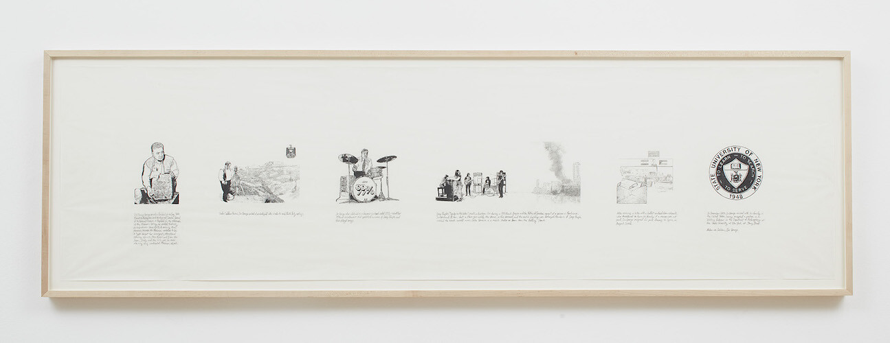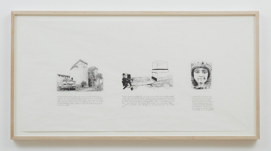 The resulting colorful, free-standing figurines, wildly variant in size, each of which represents a lost artwork returned to cultural life, are exhibited atop several tables, which recreate the processional path of Aj-ibur-shapu. Mimicking archeological exhibition modes, the minute lions, stela fragments, winged deities, falcon-headed sphinxes, archers, and reclining female figures are all accompanied by ancillary captions detailing their provenance, material, dimensions, data of discovery, and description. To these seemingly neutral descriptors, the artist adds statements from intervening agents: curators arguing whether bricking up the storage rooms would have protected the collection; anecdotes about how some items were returned; comments on how stolen antiques rank third after drug smuggling and weapons sales in the international black market; and grief over the immensity of the losses. Donald Rumsfeld is quoted claiming that the copious images of looting are simply the same image played several times over: “Is it possible that there were that many vases in the whole country? (laughs).” Dr. Donny George Youkhanna appears in a small pencil drawing, The Ballad of Donny George (Recovered, Missing, Stolen series) (2007-ongoing), playing drums. The bass drum reads “99%,” the name of his former band.