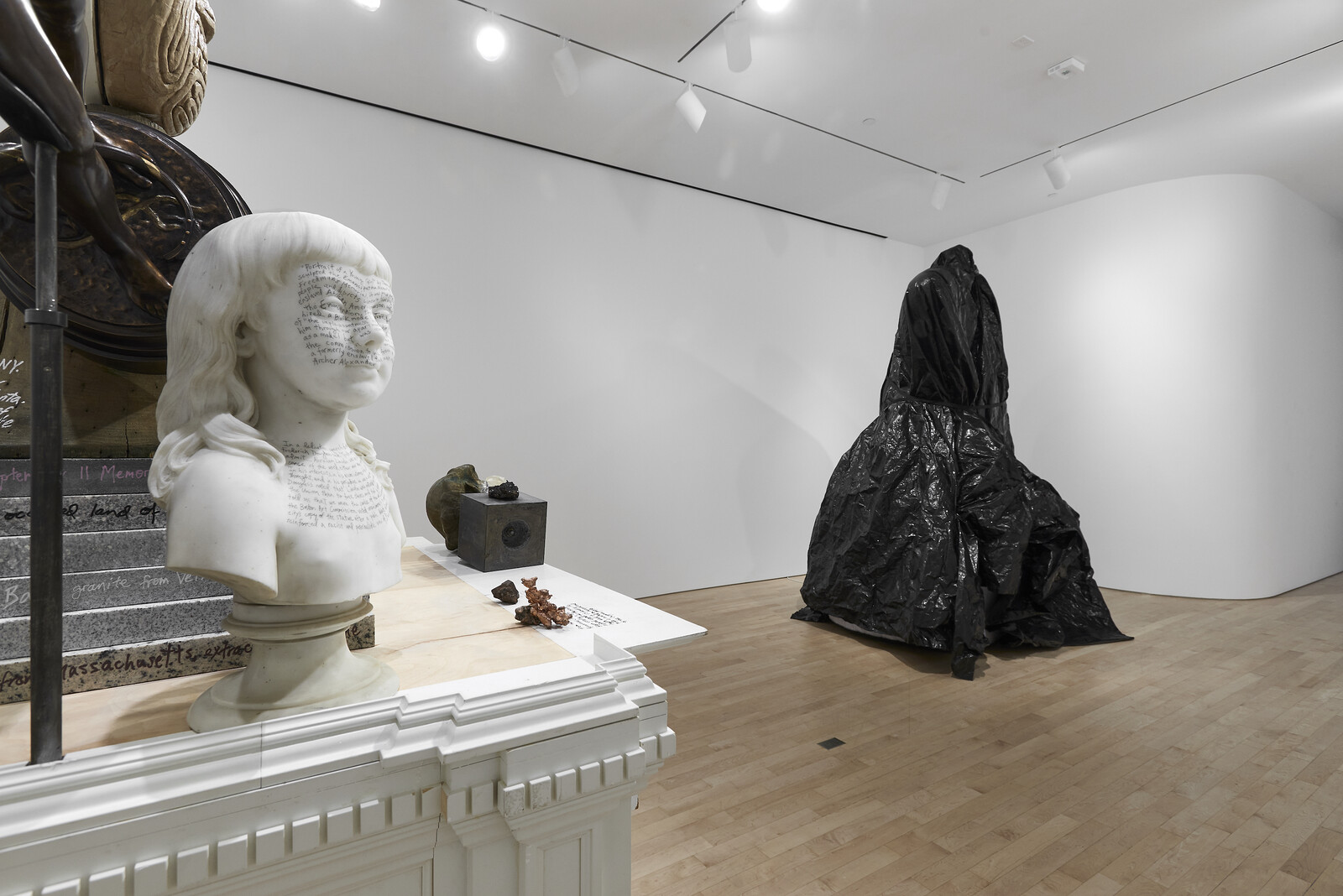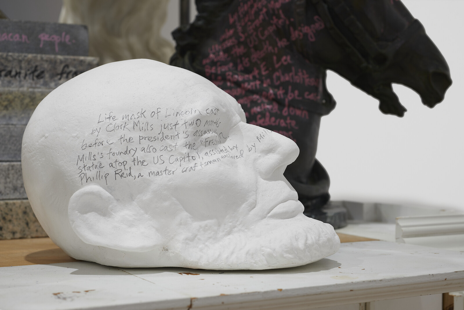 Rakowitz’s annotations, scribbled along the sides of presidential death masks, the busts of portraits, and the flanks of militarized horses, certainly augment the inventory of selected objects, offering a tightly plotted path through the ample metadata of this contested archive. And it is the tracing of their material history that is perhaps most illuminating. Yet the maximalist approach to writing here, albeit rendered with the humility of the handwritten scrawl, surfaces a primary tension. The artist himself insists that the kind of contextualization of monuments in the form of captions or interpretative plaques and media that would contend with their complex histories—a more conservative tactic often floated to avoid their removal—is complacent at best. “It doesn’t deal with the material culture of the sculpture itself or the historical material it’s meant to symbolize,” he said to Thompson. But while this prolific gloss eschews the voice of institutional authority and its disingenuities, the sheer volume of text runs other risks: information overload and its attendant forms of inattention and exhaustion.