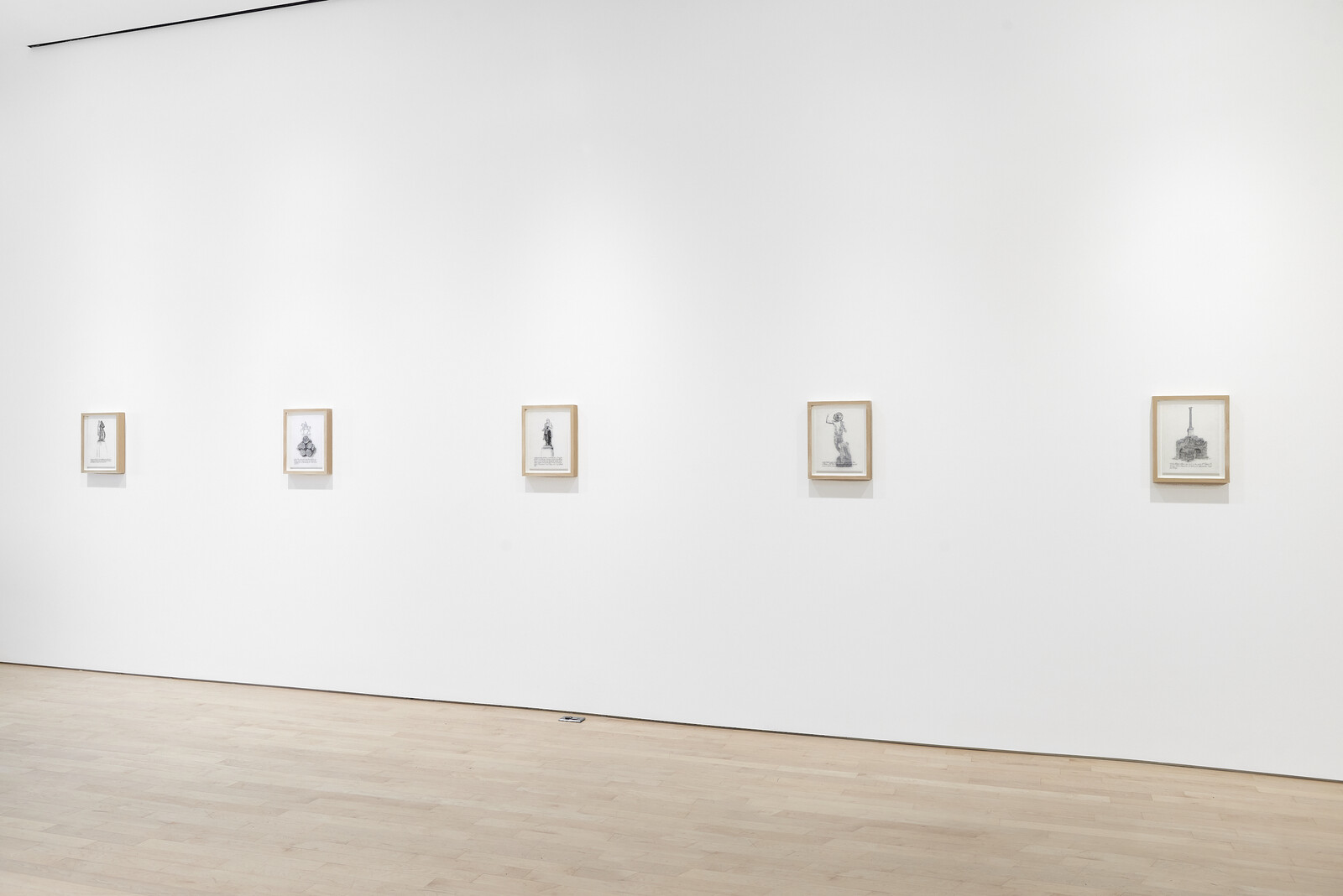 The exhibition is a neat presentation of the artist’s research on the social and material history of monuments. The most distilled of the works on show offers a methodological precis. Five framed drawings on architectural velum, Monuments in Spolia, function as historical palimpsests: in the foreground, the extant sculpture that has supplanted the former toppled or melted or transmogrified monument, which haunts the image in the background. In no.1, for instance, a statue of Lenin in Odessa is refashioned as Darth Vader by the artist Aleksandr Milov as part of Ukraine’s 2015 decommunization legislation. Rakowitz pens a caption below the image which concludes: “His helmet emits free Wi-Fi.”