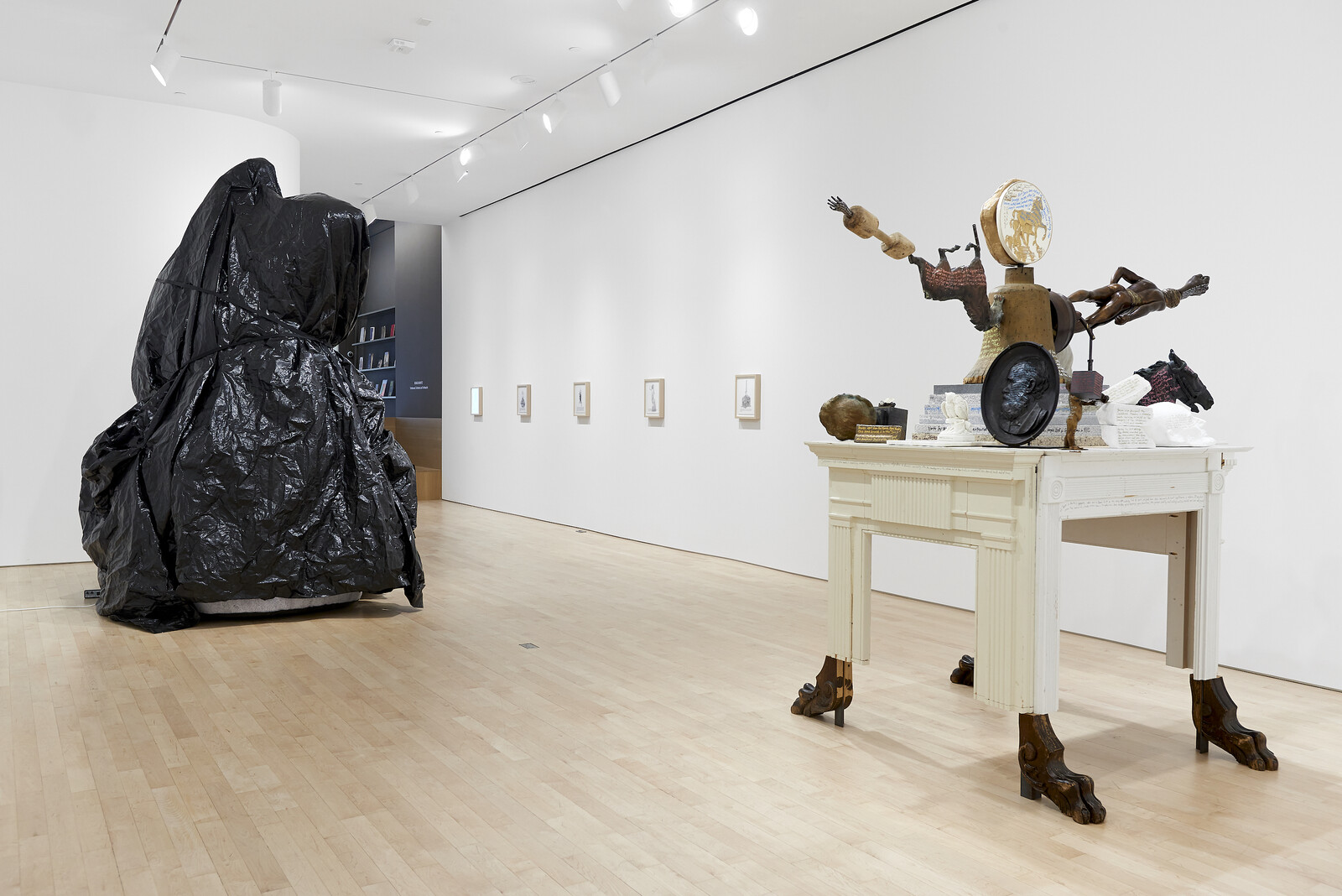 The exhibition’s title, alliteration and all, has the ring of an Aesopian fable. The Latin etymology of monument, Michael Rakowitz spells out on the edges of a sculpture, are trifold: caution (to remind, to advise, to warn), protest (demonstrate, remonstrate), monstrosity (monster). And indeed, around the gallery, the monstrous is everywhere in sight. Its forms are many: to the right, Behemoth (all works 2022), a colossal black plastic tarp obscuring the suggestion of an equestrian figure below rises tall only to fall to the ground as the fan powering its ascent clocks out. At the center, American Golem, poised on a decorative white wooden tabletop, an assemblage of found antiques and papier mâché sculptures (a strategy the artist has previously used for reproducing objects looted from Iraqi museums, highlighting the calls for their repatriation).1 The central figure, which stands on a stack of marble slabs, greets the viewer from the top of its bell-mold body and fired-clay mask—a copy of the Babylonian monster Humbaba. Gazing out at the viewer, its composite arms outstretched, it recalls Paul Klee’s Angelus Novus (1920), but even more grotesque. It doesn’t just stand on the wreckage of the past, propelled toward the future: it is the debris itself.