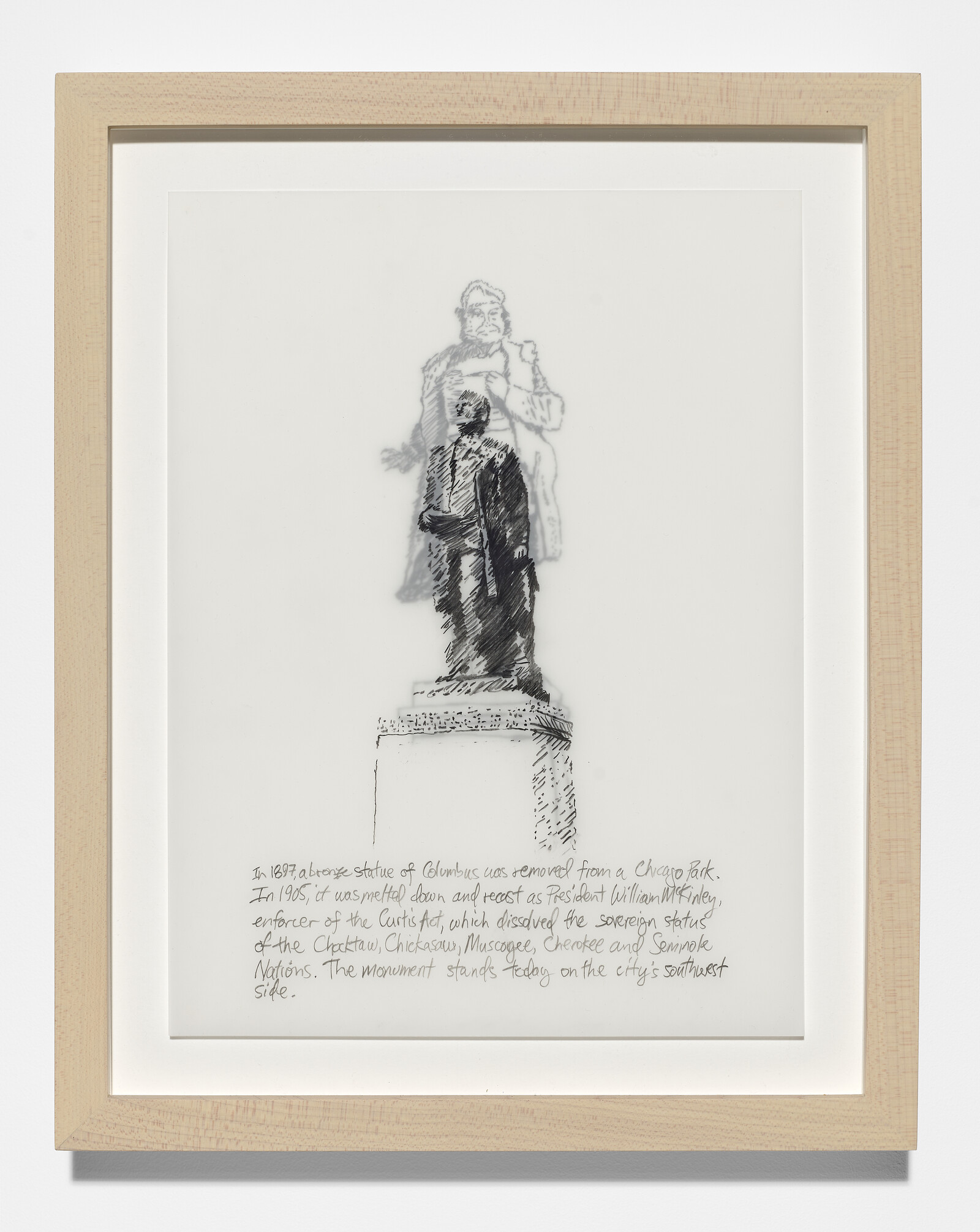 The resulting superimpositions present as orderly compositions, emphasizing continuity rather than change. Take the 1893 monument to Columbus in Grant Park, Chicago, relocated to storage after fervent critique, and melted and recast in 1897 into one of President William McKinley, dedicated in 1905. It still stands erect in a namesake park in Chicago today. From 1492 to the continued dispossession of Indigenous land and sovereignty—McKinley championed the 1898 Curtis Act, an amendment to the Dawes Act that abolished tribal court—these historical juxtapositions do not interrupt the colonial continuum. What interests Rakowitz is perhaps less the ways in which one edifice comes to replace another, than what conditions lead a monument to be erected and another to come down. When does a monument become visible again? And what remains of the past in the present?