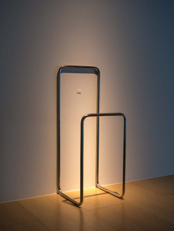 Site (1969/2016) does not use moving image. But it is clearly related to Snow’s acclaimed film Wavelength (1967), in which a static camera slowly zooms in, over the course of 45 minutes, on the far wall of a studio loft. In Site, a U-shaped stainless steel structure functions as both frame and barrier, drawing my attention to a small placard on the wall yet barring me from closeness to it. In soliciting this bodily conduct, Snow warns us to not believe the hype: movement is not freedom. As I lean forward, conscious of the restricted access, a short, typewritten text becomes legible: “I considered using, here, an image of the sea, of waves, but I finally decided to use this. Michael Snow ’69.” The artist’s trademark dry humor creeps in: he is referencing the postcard of the sea that brings Wavelength’s inexorable zoom to rest.
