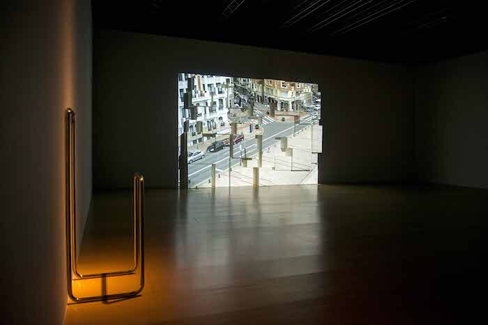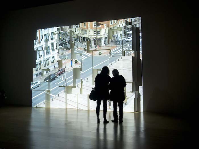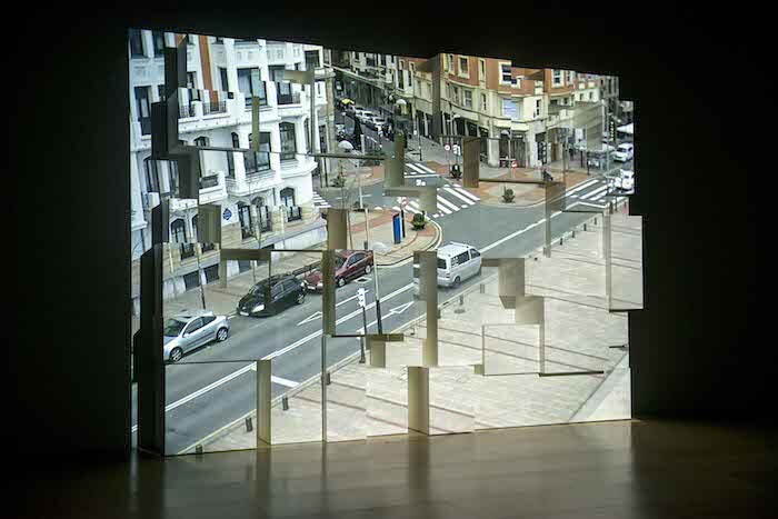 The Corner of Braque and Picasso Streets (2009) dominates the space. A live video feed from just outside the museum pipes in all the mundanity of daily life. Tourists snap photos of Frank Gehry’s out-of-frame architectural spectacle, the dogs of Bilbao take their morning walks, and delivery vans pass by. Instead of a standard screen, the image is projected onto a Tetris-like array of disused museum plinths, creating sculptural seams that fracture the integrity of the picture plane. There are, of course, no streets named for Braque and Picasso in Bilbao. The title names representation, not reality: the invocation of cubism speaks to Snow’s incorporation of quotidian materials into an aesthetics of spatio-temporal refraction. True to the interests Snow has pursued since the 1960s, the work dismantles illusionism by reversing the usual operation of flatness and depth in moving-image projection: instead of a flat screen enabling perceived depth in the image, here the sculptural relief of the screen reveals the image as a flat skin of light. The CCTV feed—the image that would seem to be most real, most proximate to the profilmic, so tied to securitization and the management of populations—here becomes plastic and malleable. But of course, as Snow knows, it always was.