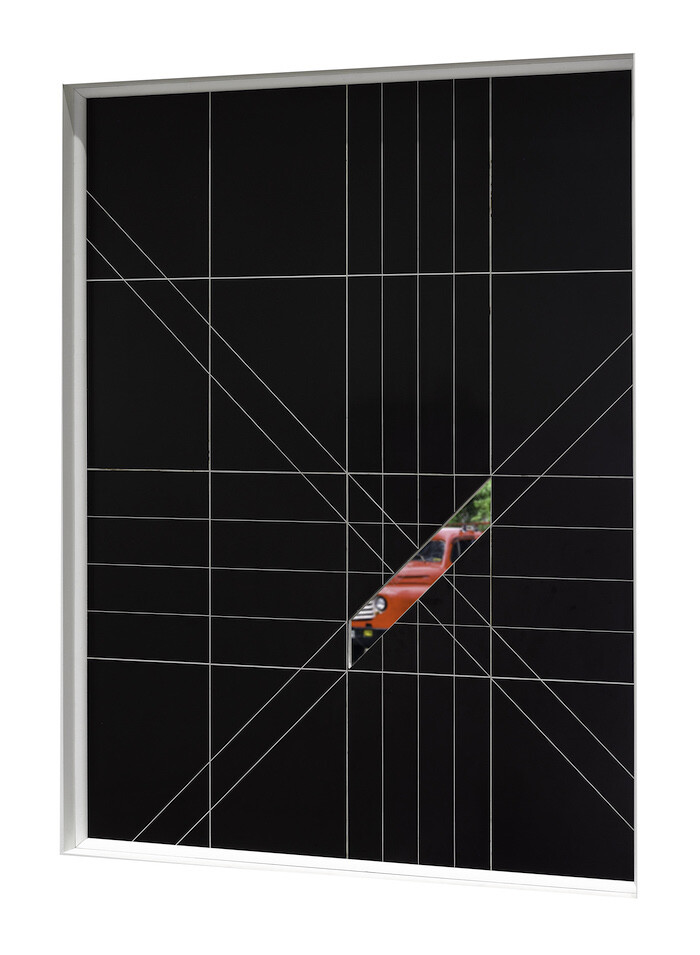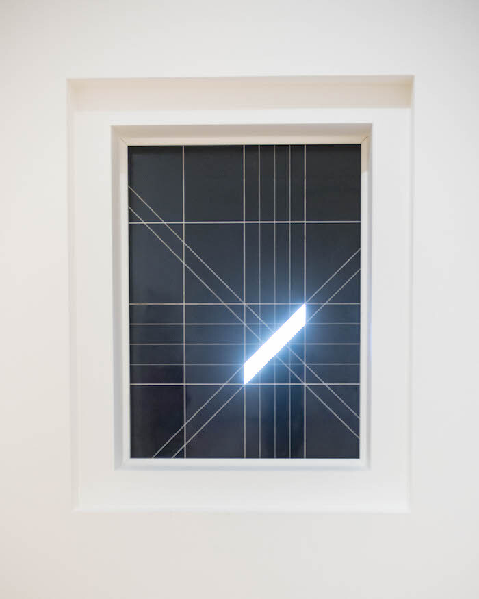 Snow’s concern with perception is signaled immediately by the titles of Sight (1968) and Observer (1974). Positioned at the entrance to “Closed Circuit,” Sight is a black window covering made of aluminum and plastic, mostly blocking the view of the Nervión river outside, save for a diagonal rhomboid aperture excised from its geometrical patterning. Faced with the resulting tension between interior and exterior, surface and depth—themes that recur elsewhere in the exhibition—binocular vision falters, leading to a phenomenological reduction whereby I see myself seeing.