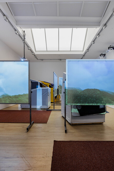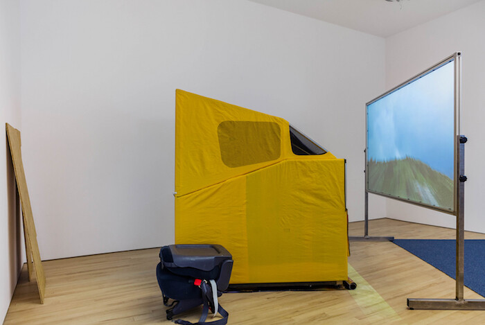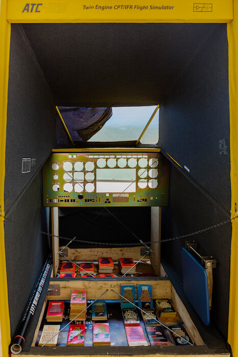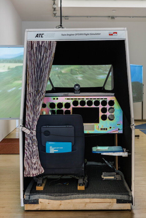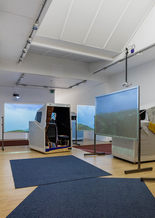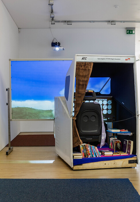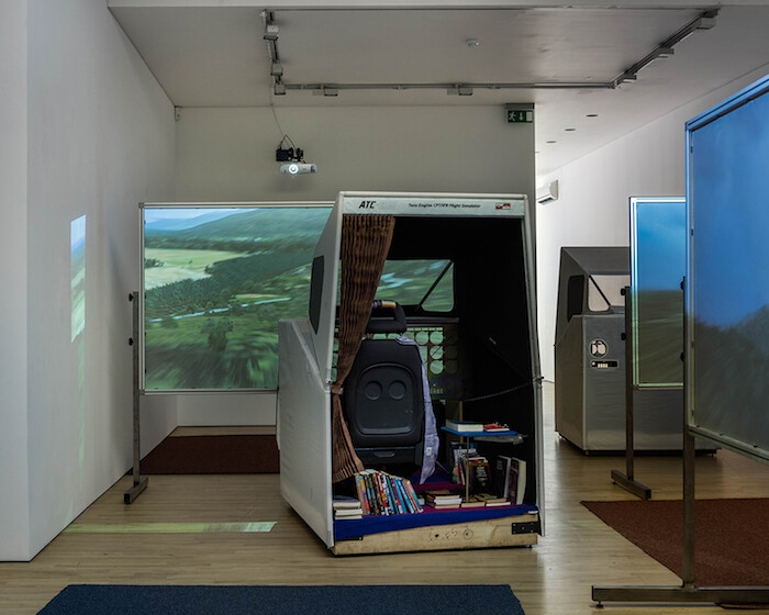 Stevenson’s installation at Carl Freedman Gallery comprises four hand-built 1980s flight simulators, all of them facing screens onto which digital renderings of a flight over a forest in Papua New Guinea are projected. Visitors are unable to enter into the unmanned cockpits, and the simulators appear to fly themselves, heading back and forth across a real route between villages hidden in the mountains. Although there are no nuns in sight, each cockpit carries its own collection of evangelical and millenarian books, dating from the 1960s onwards, by authors involved with the School of World Missions at Fuller Seminary in Pasadena, a movement which became known as Signs and Wonders. The books are a reminder of the shock that has always come with the meeting of Christianity and local belief systems, however charitable the missionary schools’ ostensible aims.