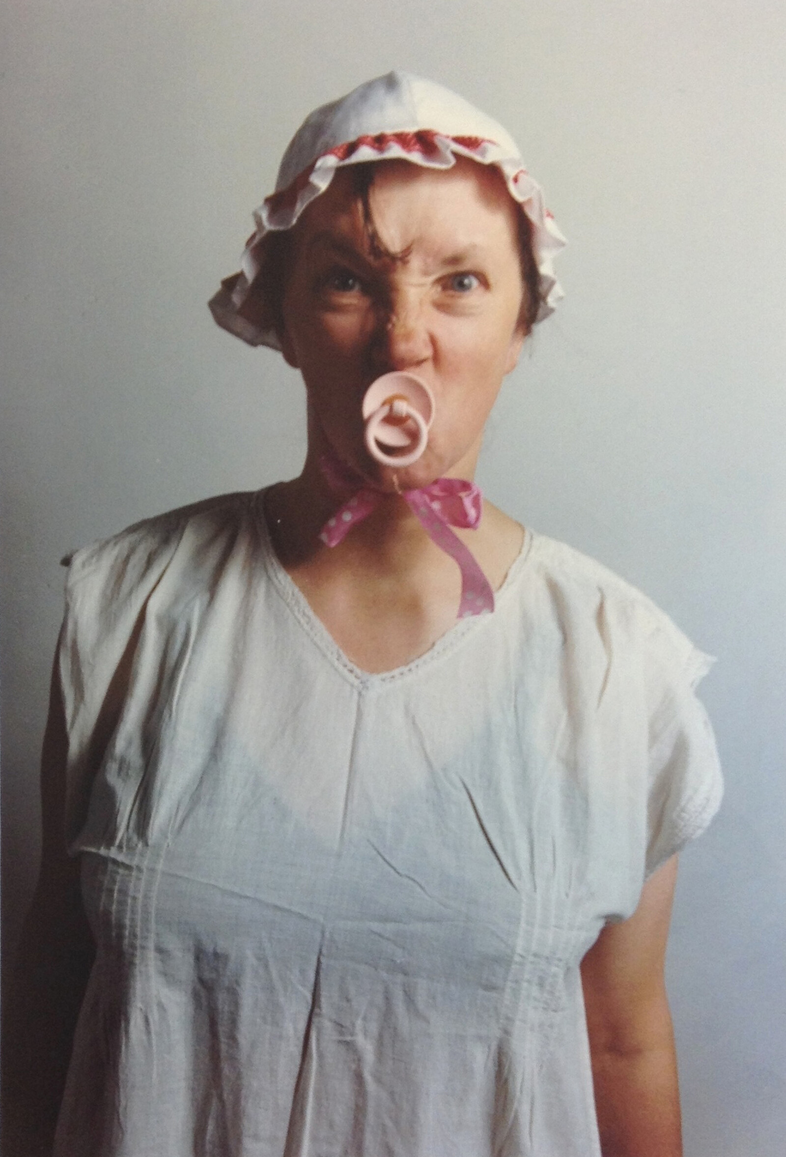 Spence was referring to the cancer ward, with its spotless walls and bleached floors, its doctors in white coats and surgeons in white masks. The Picture of Health? (1982–86), a photo montage comprising dozens of laminated collages made with Terry Dennett, Rosy Martin, and Maggie Murray, is the largest of her works on display. Covering four years of her life, and two large walls, it echoes the diaristic, improvised feel of her scrapbooks: staged self-portraits pasted onto colored card alongside newspaper clippings, polemical texts, and photographs taken in the hospital. Spence’s confusion, terror, and fury are palpable, but so are her defiance and humor. In one panel, she describes an occasion when, without introducing himself or asking permission, a young male doctor drew an X on the skin above her left breast, and told her he was going to remove it. She was 48, but the experience made her feel as powerless as a child. In “Phototherapy,” a cycle of self-portraits made in collaboration with Martin between 1984 and ’86, Spence dresses as a snarling baby, a toddler, and an angry child: a punkish parody of the infantilizing effects of her treatment.