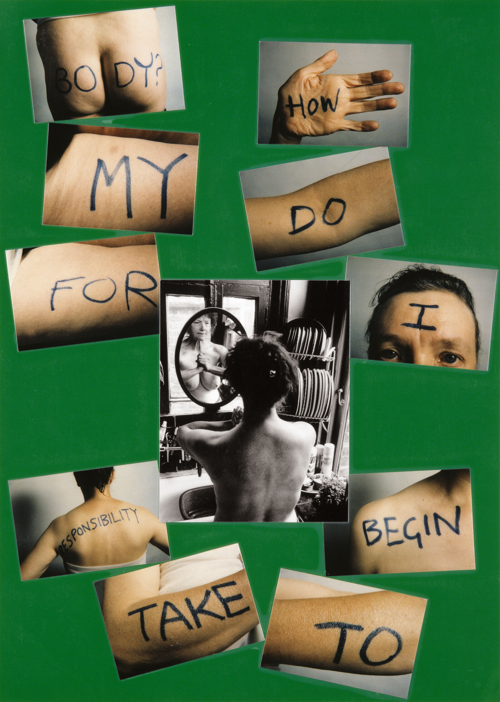 Influenced by Bertolt Brecht’s ideas on the importance of visual education, Spence often made work using materials that could be both accessible and disseminated widely. “This is a people poster,” reads a segment of Beyond the Family Album. In private, she produced scrapbooks, which incorporated writing, personal photographs, nutritional plans, and newspapers clippings. On one, the word “CANCER” is scrawled in black felt tip across a photograph of Prince Charles and Princess Diana. Another double spread asks, “How do I give up RESPONSIBILITIES without being ILL?” That question, among others, reverberates throughout both Cancer Shock (1982–84) and The Picture of Health? (1982–86), particularly in her 1982 self-portrait, in which “Property of Jo Spence?” is written across her bandaged breast. In the late 1980s, Spence used her experience of breast cancer as a nexus to explore the stigmatization and infantilization of the ill and aged, in addition to considering the difficulty of retaining psychic or physical autonomy within the space of healthcare. Spence saw individual bodies as nuanced sites of intersecting political conflicts. For example, the work particularly connects the objectifying medical gaze with the way women’s breasts were perpetually fetishized in popular advertising and pornography.