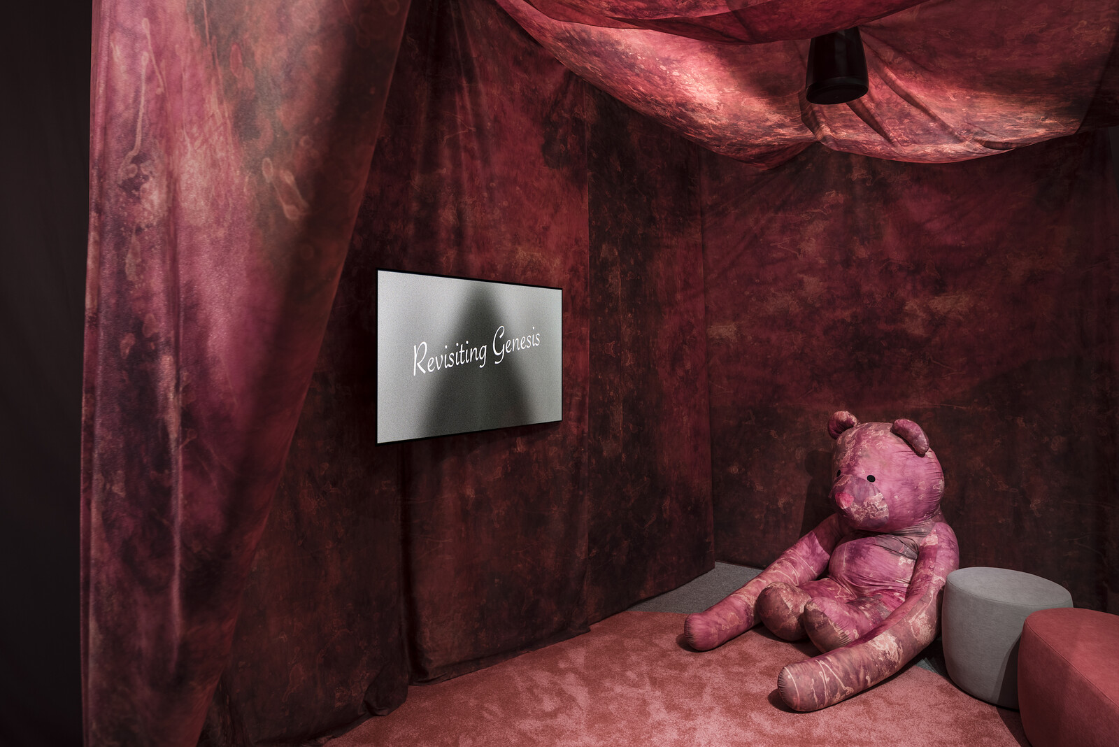 An activist, Spence intended for her personal experience to be a catalyst in enacting wider social change: she was invested in the liberation of women, the working class, and other marginalized communities. Similarly, in the roundtable discussion published in the exhibition’s accompanying booklet, Ashery talks about the interplay between the intimacy of both artworks and the institutional scale of the Wellcome: “this is where the politics are situated: between the private and personal themes and how a large audience will encounter this.”3 The multiple tent-like viewing environments in which episodes of “Revisiting Genesis” are screened have been carefully designed in order to be soft and comfortable for those with chronic illness or pain. Their tie-dye fabrics and the giant teddy bear shaped beanbags lean into the saccharine tendencies favored by establishments of care. The episodes intersperse the fictional story of Genesis—a dying artist and an allegory for the invisibility of female artists—with real-life experiences from individuals who live with life-limiting illness and conditions like cystic fibrosis, cancer, and Crohn’s disease. The narrative questions the role of death in the contemporary digital era: the effect of social media on grieving, breaches of privacy, and emergent technologies, such as AR gravestones. The gaze of social media—the body as statistics, an algorithm, data to be harvested—is analogous to the medical or patriarchal gaze interrogated by Spence.