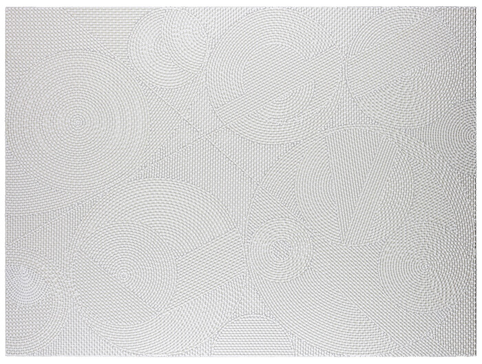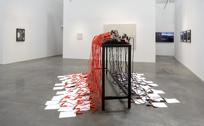 While the show succeeds in sidestepping a region-pleasing, best-of approach to Fatmi’s work (notably anything with Koranic texts), it also seems to have backed itself into an anecdotal take on a single figure, meaning the stronger works take an undeserved backseat to Griffin’s transformation. Both Inside the Fire Circle (2017)—a bank of vintage typewriters linked up to jumper cables connected to pristine sheets of white A4 paper languishing on the floor—and Kissing Circles 09 (2010-11)—Fatmi’s tried-and-true all-white coaxial antenna cables, painstakingly snipped and set in a static ballet of cog-like circles—level far more impact while dealing with the archive, obsolescence, language, and our unwritten future.
