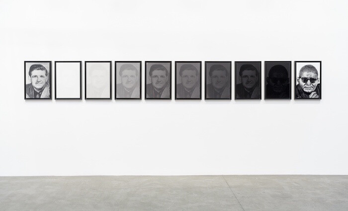 It is precisely Fatmi’s sensitivity to language that is lacking from the Griffin works. Since Griffin himself was exiled from the language of the other (“Teach me how to speak,” he implores the black shoeshine worker he takes into his confidence in Black Like Me), he was reduced to a surface, a skin color. Perhaps Fatmi’s insistence on the purely visual result of his metamorphosis drives this point home. But ultimately the works lack the ballast that would endow them with the necessary tension. For now, like shoe polish—as loaded as it may be with ironic tones of instrumentalized racial transformation—they just fade away, without further consequence.