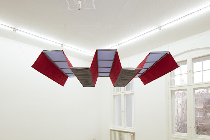 Contrasting the petrified nature of these molting masses, the exhibition’s title connotes strength and speed. Overhanging the gallery rooms, Musa installed several suspended marquees, made of striped fabric. In their ancillary text, the artists recount their visit to a small aerodrome, where pilots learn to fly. As they watched the monoplanes, the flight instructor explained why airplanes fall from the sky: the “aeroplane wishes to become the ground,” and in order to counter that desire the pilot must “become the aeroplane.” Overhead another pilot, flying amid the turbulence of air currents, tried repeatedly to approach the landing strip, failing to land at each attempt. Whilst this battle of wills unfolded, the artists fantasized about seeing the pilot’s body turning from flesh into metal and glass—until he finally gave up and landed at another aerodrome. Mathematician Norbert Wiener observed a similar situation while working to optimize anti-aircraft warfare during World War II: pilots, trying to stabilize their machines while evading enemy fire and the sweep of searchlights, would probably feel the airplane has volition, as if it were inhabited by a gremlin.2 Wiener’s conclusion was twofold: “Our consciousness of will in another person,” he argued, “is just that sense of encountering a self-maintaining mechanism aiding or opposing our actions.”3 And, cybernetically speaking, the nervous system and automatic machinery are fundamentally alike. But whether organic or mechanic every system devolves toward a state of maximum entropy (the thermodynamic term for the Freudian death-drive): much like the airplane has an urge to crash into the ground, “the stable state of a living organism is to be dead.”4