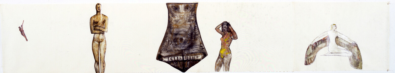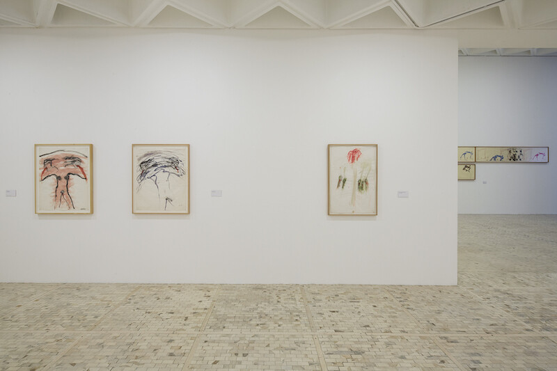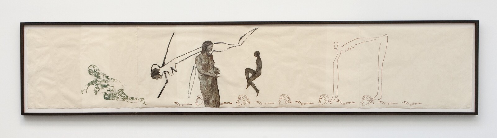 This retrospective follows another trajectory, too—one of disintegration. The exhibition’s first two rooms, featuring the “Black Paintings” (1959–65) and the “War” drawings, respectively, are hung conventionally at eye-level. The works that follow in the last two, and much larger, rooms have edged apart to use the lower and upper portions of the walls, in what could be described as “expressive” placements (Ault’s three selections from the 34 scrolls of the “Codex Artaud” [1971–72] appear framed in a staggered stack) or even site-specific gestures, like the series of long horizontal works on paper (like Sheela and the Dildo Dancer) that hug the gallery’s ceiling like a frieze. The hang in the last room, especially, develops an interplay between works and sightlines so that supplicating figures (Mourning Women No. 3, 1989) appear inches from the floor, as magisterial ones (Artemis, Goddess and Centaur, 1983) look down on them. Ault uses the museum’s long ramp to great effect: a nearly identical, level pair of prints of a medieval European fertility symbol (an impish figure/gargoyle spreading apart its conch-like vulva) bracket the ramp’s length, so that one hangs at the usual 60 inches while the other at the ramp’s bottom winds up well above the viewer’s head. It is as if time has actually passed between them.