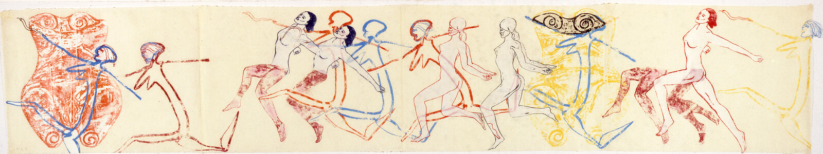 Who was here first—Nancy Spero, or Hernán Cortés? It may be too much to call Spero (or anyone) a “universal” artist but her work certainly speaks to the weird postcolonial hybrids that survive as culture in the twenty-first century. Especially in this retrospective at the Museo Tamayo, a Brutalist building that shares a civic park and former world’s fair ground with Mexico City’s renowned Museo Nacional de Antropología, the scrolls, codices, and friezes that give form to Spero’s last four decades of printmaking—her Mediterranean references—make uneasy sense. In modern Mexico, layers of Spanish colonial, Aztec, and agrarian socialist civilizations build on the last’s rubble; for instance, a pre-contact, snake-shaped stone bowl fitted to a Mission era octagonal plinth becomes a font for holy water that is only superficially Catholic. Spero’s work, likewise, both matches and clashes perfectly with what’s already here. Thus the slight dissonance when you recognize in something like her series of figures dancing across long horizontal framed “scrolls,” such as Sheela and the Dildo Dancer (1987), the format of certain Mayan temple carvings. Whether this correspondence was the specific intent of guest curator Julie Ault and/or her Mexican hosts, or simply a kind of generic congruence of classical civilizations, the result is a resounding testament to Spero’s major theme: the epochal suffering of women and the innocent.