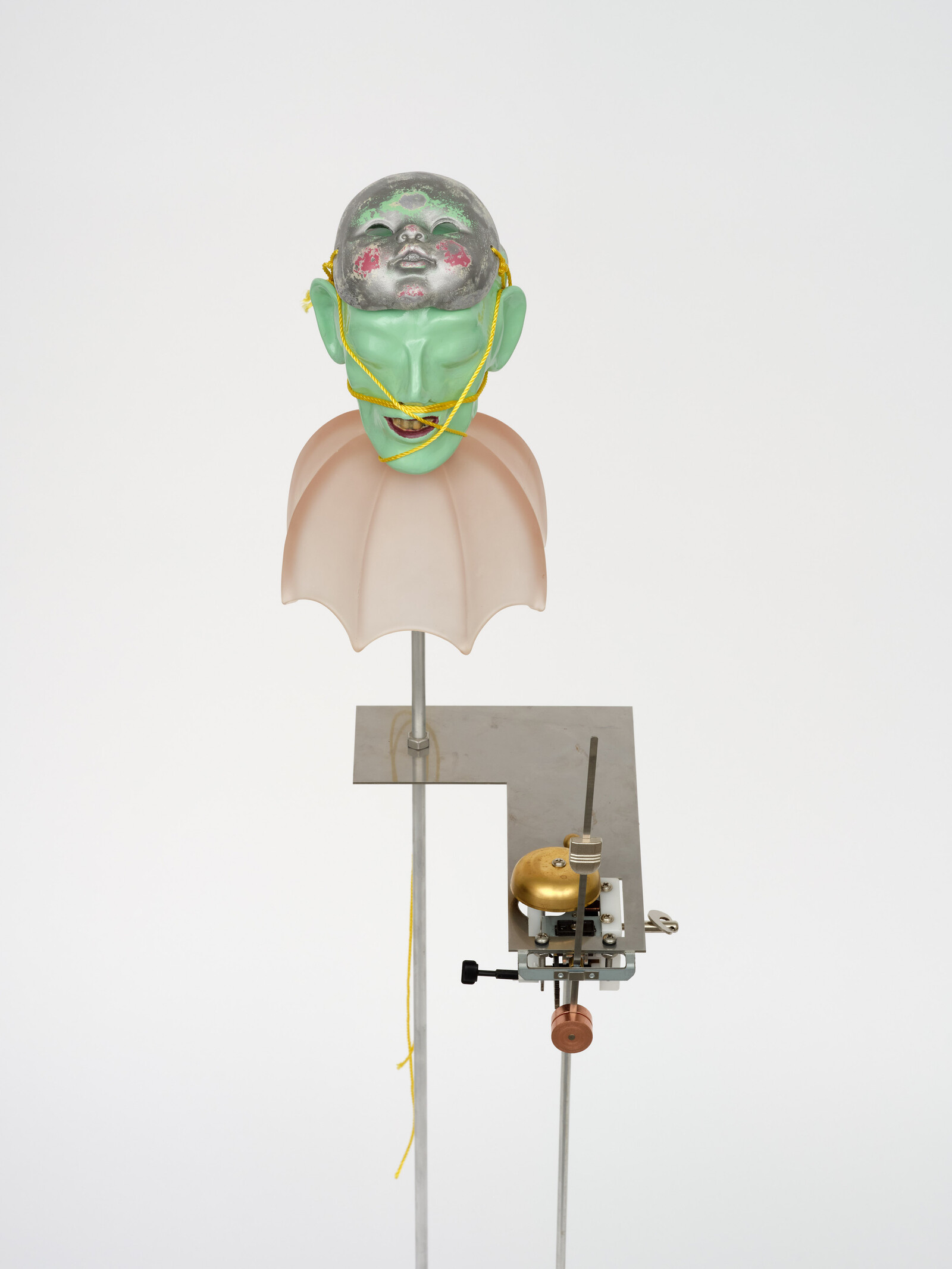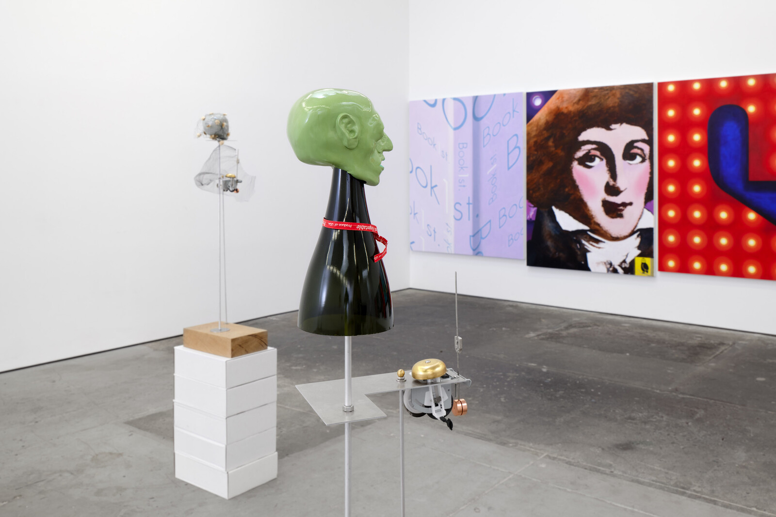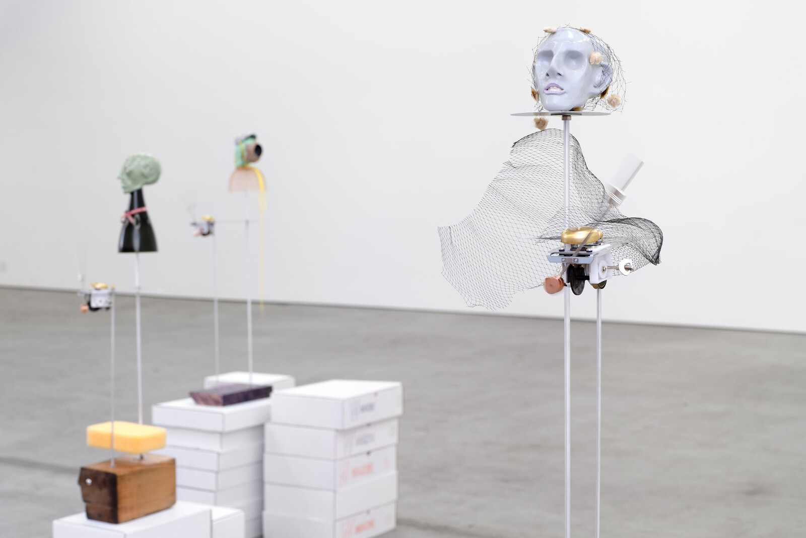 The viewer is able to wind up the “critics,” letting them spin their wheels while looking around the show. The result is a rhythmic kind of chatter punctuated with the ding of a bell, as if to signal a lightbulb moment. Sitting atop stacks of white archival boxes crudely labeled with the names of various art and culture magazines, from Frieze to Vanity Fair, the critic figures appear to have emerged from, or will soon return to, a storage space, resigned to a life of stasis contingent on the vitality of their publications. (At the opening, a bouquet of flowers gifted to the artist lay on the boxes labeled Artforum like an offering on a grave.)