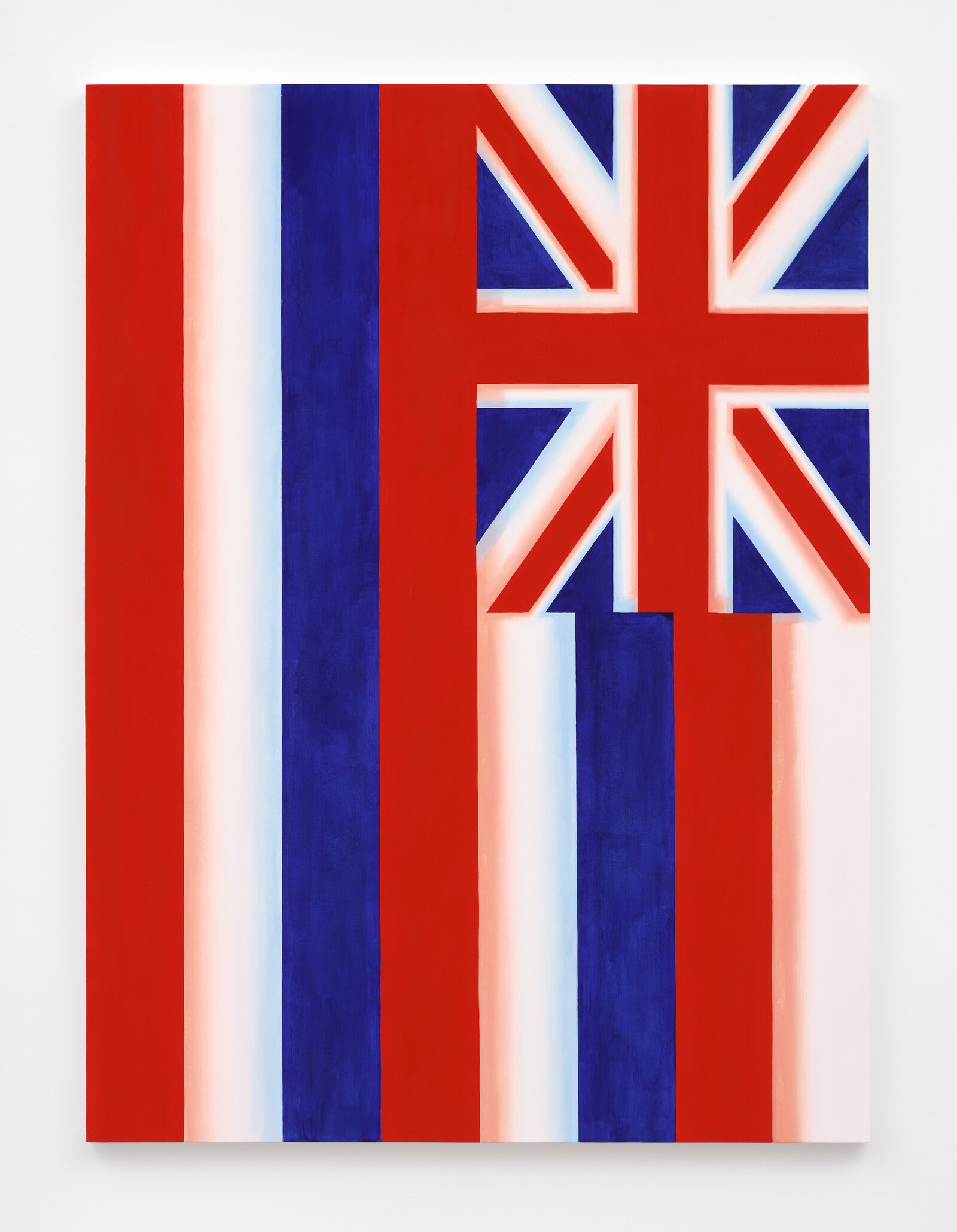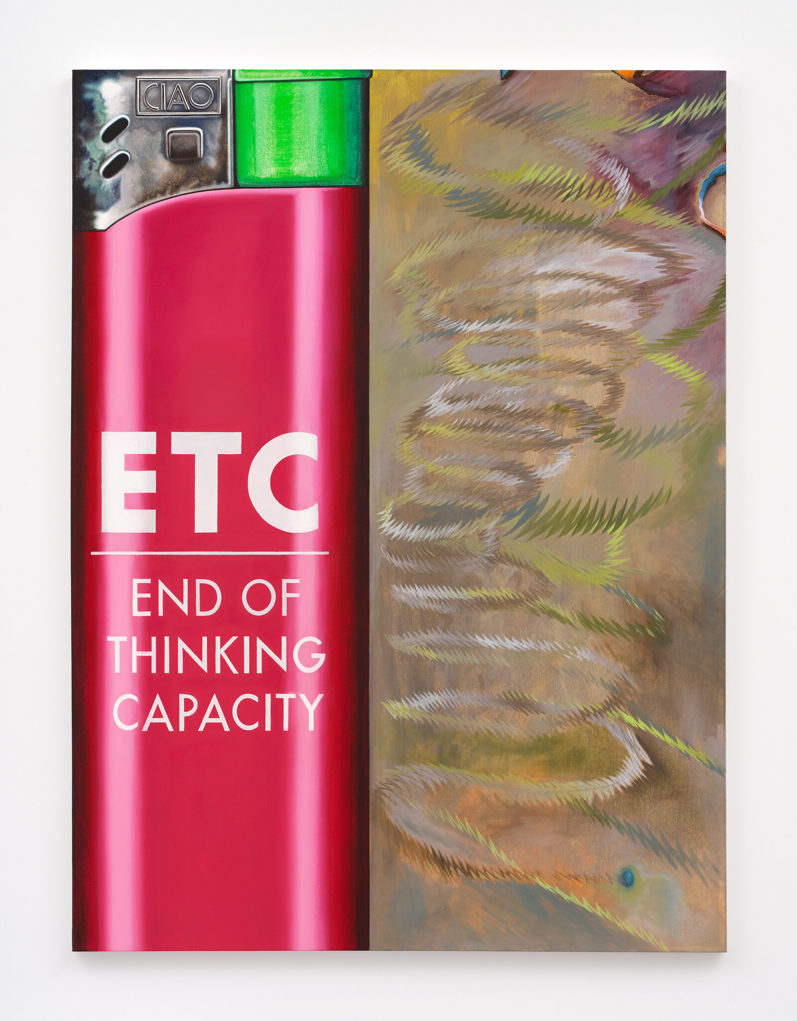 The twelve paintings invoke a number of styles and subject matter—some taken from other painters, including a scaled-up reproduction of a painting by the artist’s wife Alexandra Noel, of an image from a French cigarette label—and depict among other things a Hawaiian flag turned through ninety degrees, the mother of Marine Le Pen as a slutty French maid in an image taken from a 1987 Playboy shoot, and a lighter bearing the name of the exhibition and the acronym that means it is sometimes, falsely, cited as an etymology for the abbreviation of et cetera. The works almost exist as stand-ins for the Big Paintings that dominate the art world Sutter-Shudo seems to be responding to, yet these well-executed examples do not feel ironic or cynical so much as whimsical.