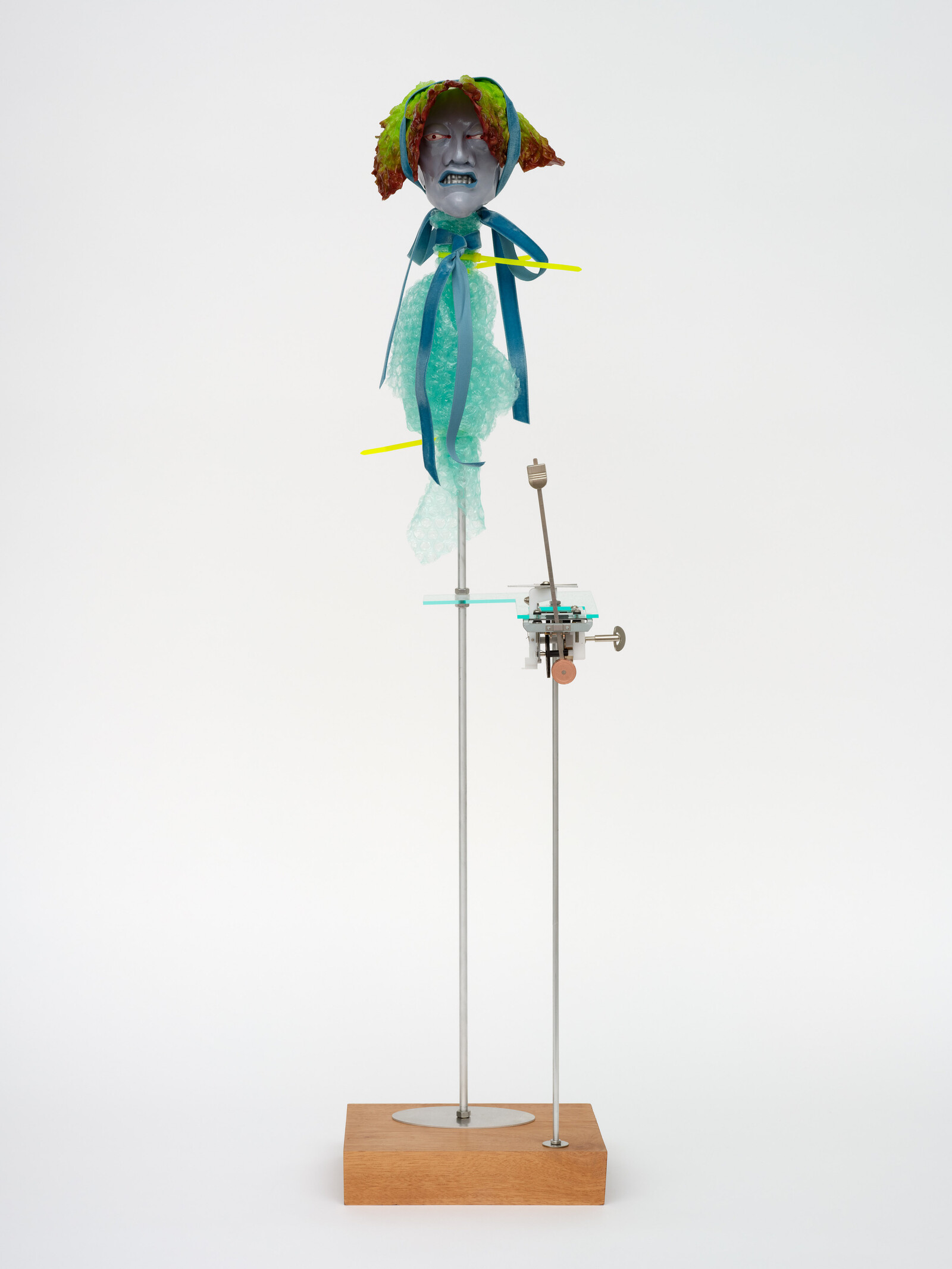 Naoki Sutter-Shudo addresses the current critical landscape with a series of seven “Critical Figures” and twelve paintings. Installed in only one half of the gallery, the audience of figurative sculptures faces a wall on which is hung a row of large graphic canvasses. Each is adorned with a formal accessory made of flimsy material: a wire twist-tie shaped into a tie, a fake lettuce hat, a shirt made of bubble wrap or a plastic bag. The figures’ apparent attempts to present as professional are rendered ridiculous by the nature of their clothing. They look as though they’re dressed for a nineteenth-century salon—complete with bonnets, big collars, and ties—rather than a contemporary art gallery. Each figure’s body has an intricately constructed apparatus holding a wind-up metronome with a bell (some in 3/4 time, others in 1/4 time) and has a unique look, height, and facial expression tending towards the bizarre—one has three heads, for example.