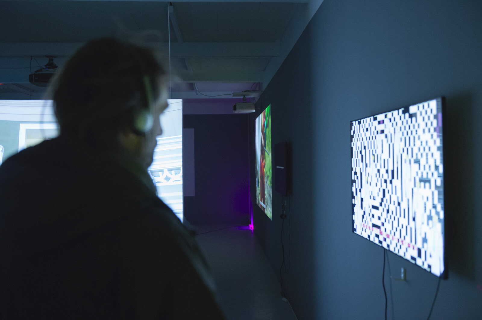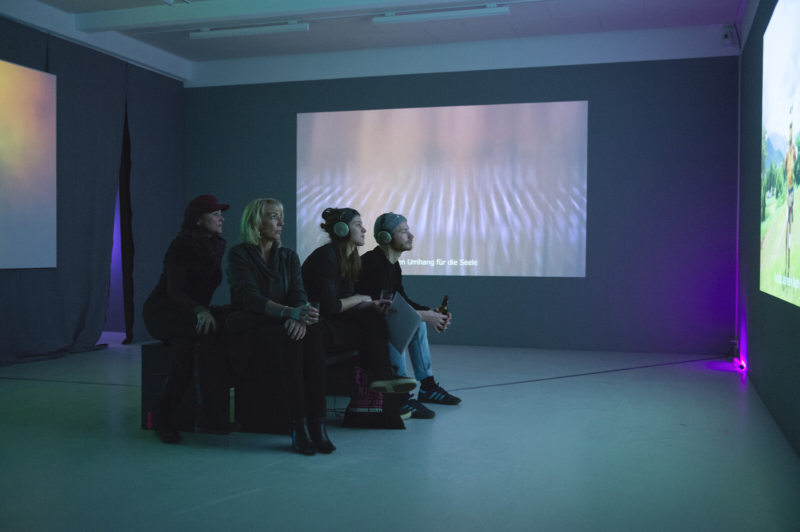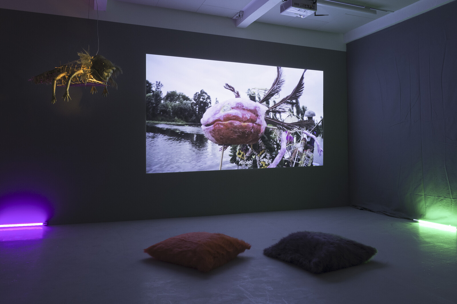 Naomi Rincón Gallardo’s solo exhibition at Kunstraum Innsbruck, “MAY YOUR THUNDER BREAK THE SKY,” is a maze of monitor screens and video projections. Rincón Gallardo’s aesthetics are mesmerizing: silver-faced goddesses; crimson electronic nipple extensions that blink playfully; elaborate handmade costumes in red and gold shot against deep-green cabbage fields and murky river water. The exhibition comprises two works: The Formaldehyde Trip (2017), a constellation of three- to five-minute video fragments that occupies the main gallery, and Opossum Resilience (2019), a new video installation, which is shown in an adjacent room. Crafted sculptures dot the spaces in between the moving images. The axolotl—a species of salamander native only to Lake Xochimilco in Mexico City, and the mythological spirit animal of Xolotl, the god of monstrosities—is everywhere in the exhibition.1