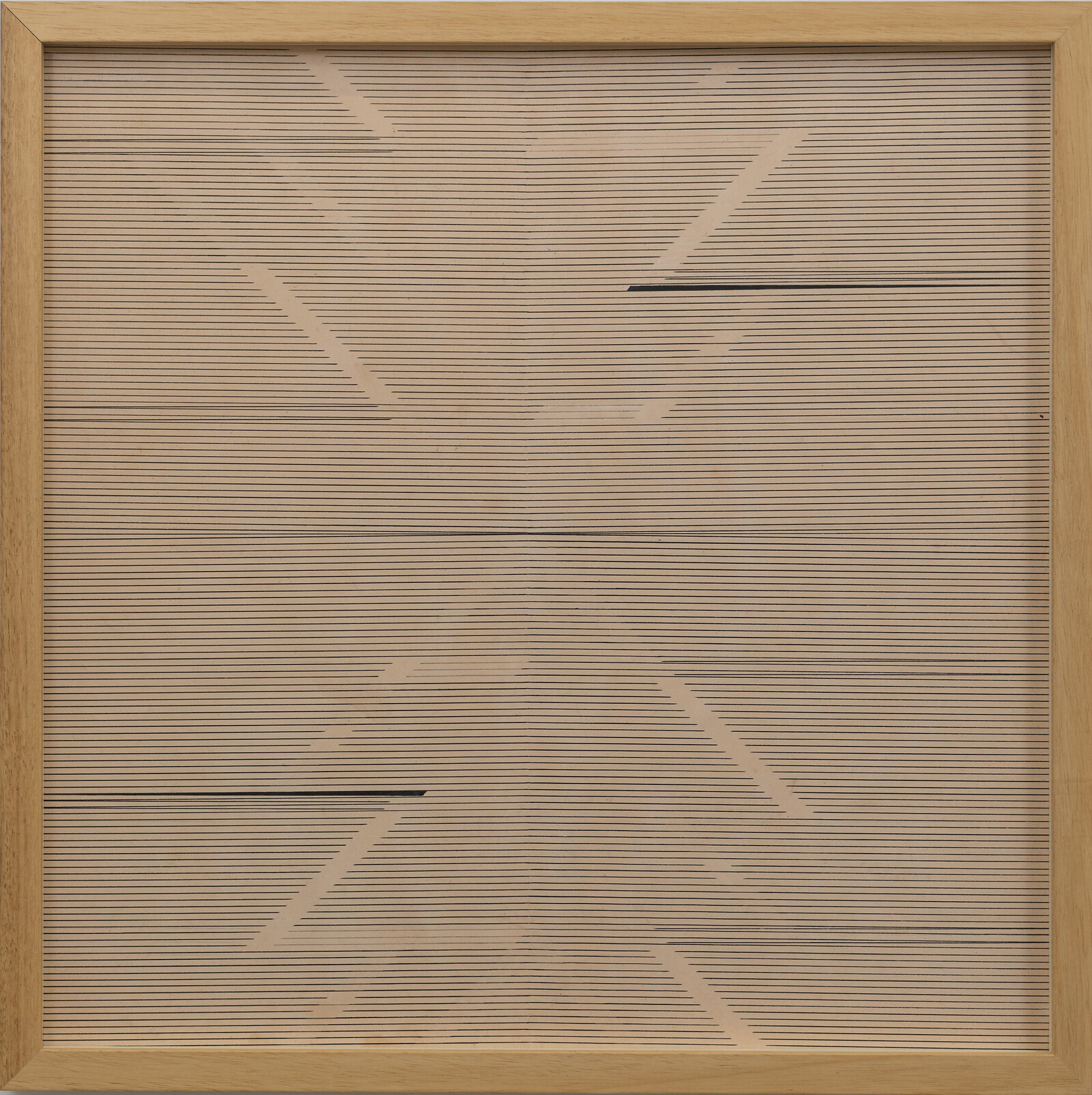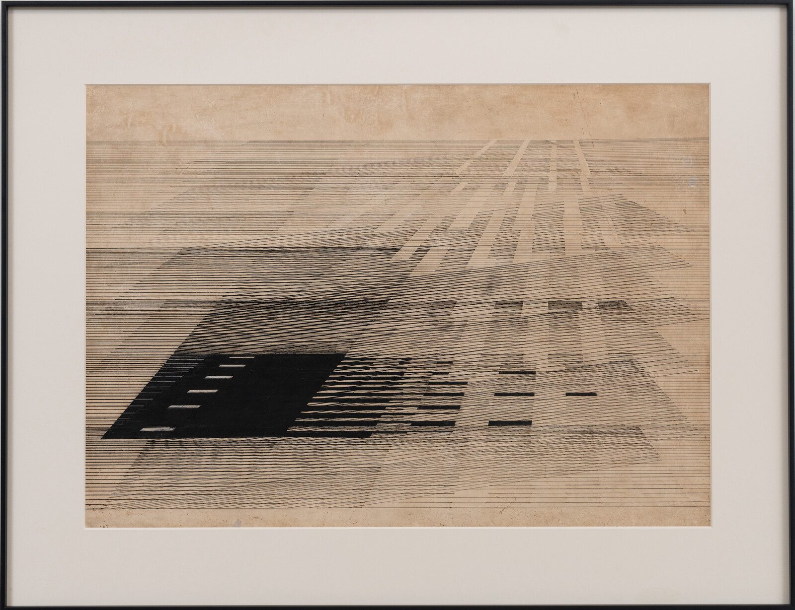 An untitled 1966 canvas by Gaitonde, of grey-scale marks on a blue horizon, is among the few pieces by Mohamedi’s contemporaries curated into this multi-dimensional reflection on the artist’s life and work. The show encompasses archival documents, ephemera, and artworks from across decades, but a sequence of ink on paper compositions from the mid-1960s tracks a seismic shift in her practice. A work from circa 1965 shows a web of abstracted dandelion and dried leaf–like forms moving across the page like neurons seeking connections, demonstrating a shift towards minimalism. As does the one beside it, where fluid strokes give way to exuberant, overlapping nemaline scratches, whose cumulative shape is echoed in the next painting, where leaves are etched into black-ink shrubs on a smudged grey ground. What follows is a pen-and-ink composition capturing the distillation of expressive marks into graphic lines that Mohamedi developed in the 1970s. With economic precision, vertical dashes form architectural rows diagonally up from the bottom right to the left of the image, where equidistant spacing transitions to a trail-off, as horizontal lines create connecting bands moving down from the top right on a diagonal axis, recalling visual impressions of sonic beats.