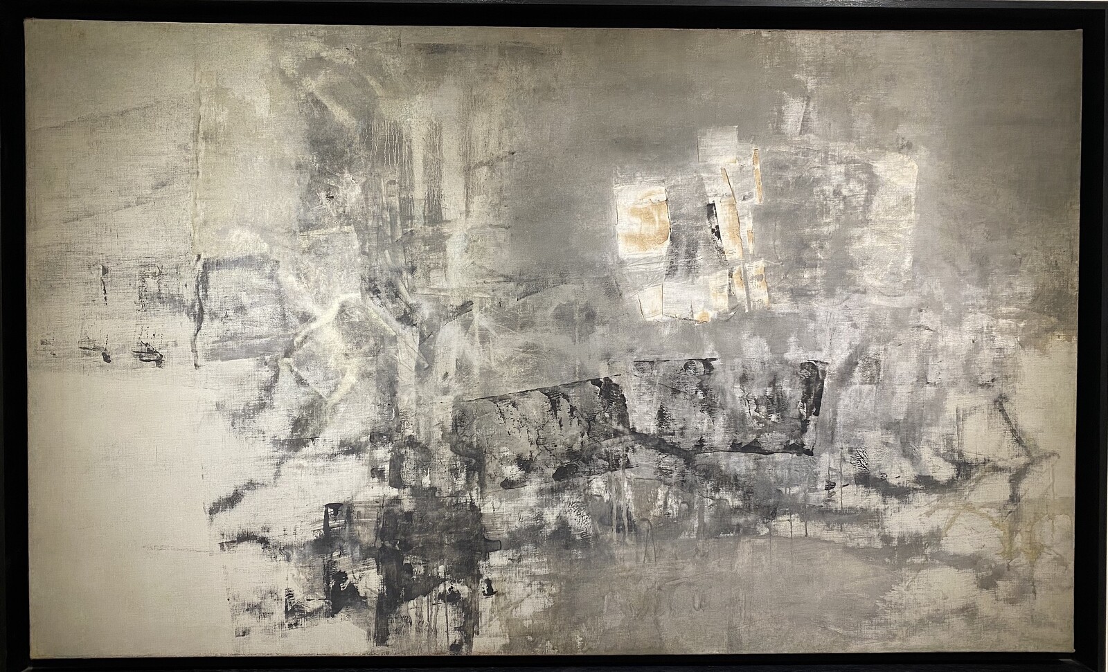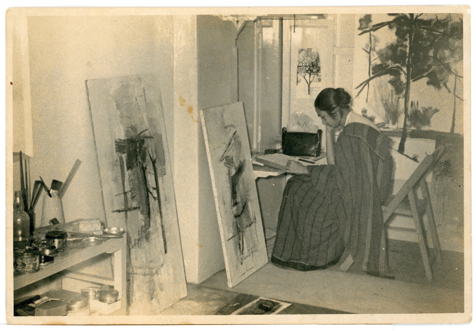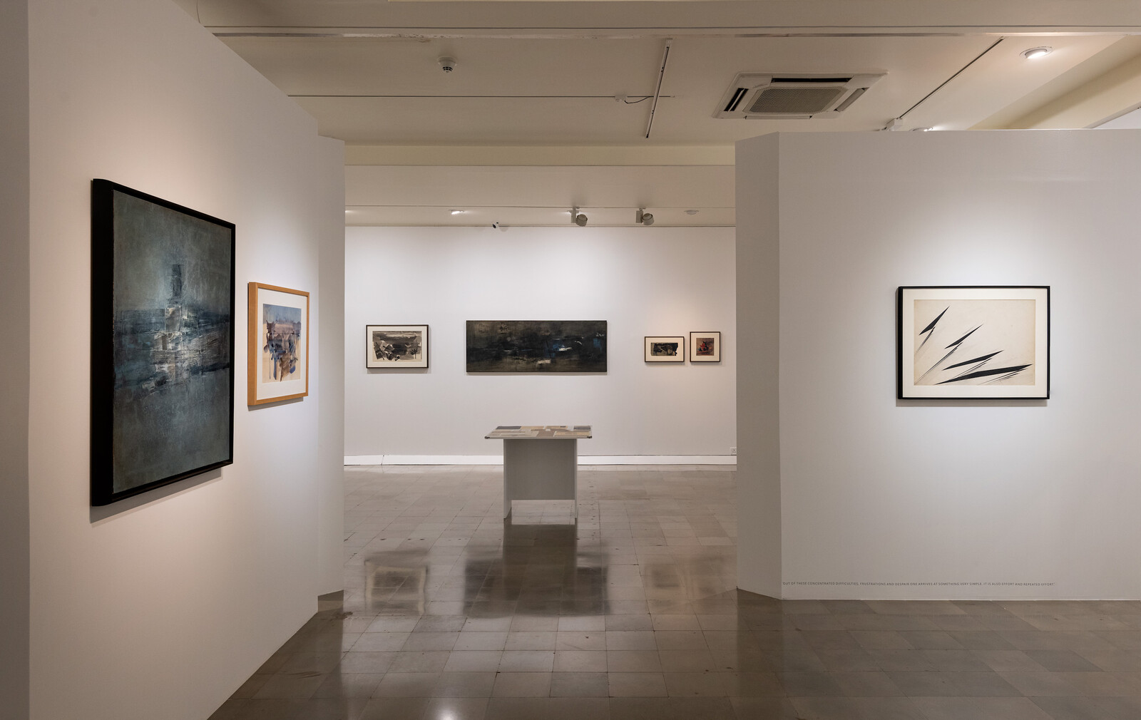 In 1964, Nasreen Mohamedi, who moved to Mumbai from Karachi three years before Partition, wrote about the experience of continuous conflict. “I sit here and try and find a unity,” she wrote in her diary, “not between religions but between people and people.”1 The artist had returned to India the previous year from Paris, where she studied lithography following her first solo show at Gallery 59 in Mumbai’s Bhulabhai Desai Memorial Institute. A black-and-white photograph showing Mohamedi in her studio is displayed among others in “The Vastness, Again & Again,” curated by Puja Vaish at Mumbai’s Jehangir Nicholson Art Foundation. In the image, dated ca. 1959–1961, Mohamedi sits among abstract paintings resembling those she made in the 1960s (she rarely dated or titled her work). One such composition in “The Vastness” is an abstract blue-scale oil on canvas impression of what resembles a hazy waterside structure and its reflection, recalling the palette knife and roller compositions of V.S. Gaitonde, with whom Mohamedi shared an affinity for abstraction, Zen Buddhism, and Paul Klee.