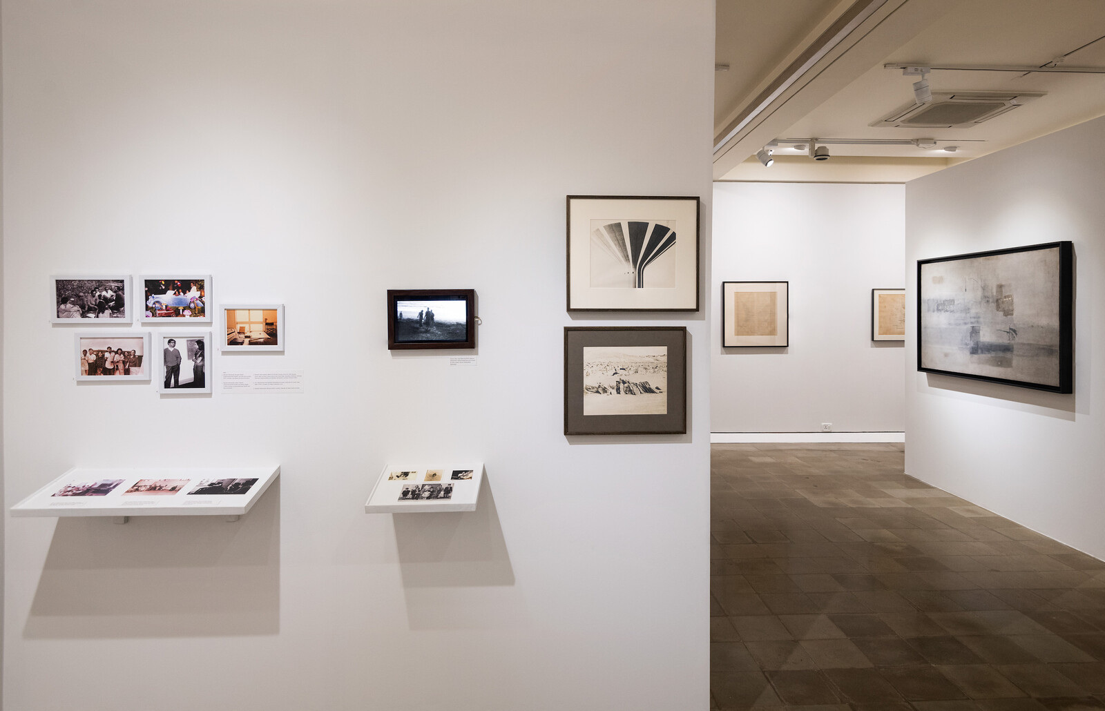 Never exhibited in her lifetime, Mohamedi’s photographs of natural and built environments reveal an artist so immersed in the world that she had to zoom in. While subjects are often obscured by tight crops, one collection of small prints in “The Vastness” does offer immediately identifiable views, from the edge of bicycle wheels and feet on the ground, to one shot where a dog’s curved tail is isolated by a black rectangle drawn on like a viewfinder. Operating like notated sketches, each image outlines forms and angles that Mohamedi observed wherever she went; from Kihim’s coastlines to Le Corbusier’s modernist buildings at Chandigarh, which induced the same hypnotic feeling that Mohamedi experienced at the sixteenth-century red-stone Mughal city of Fatehpur Sikri. She mentions this in a letter presented among others addressed to artist Nilima Sheikh, who appears in photos nearby of Mohamedi with contemporaries like Bhupen Khakhar, and her Maharaja Sayajirao University of Baroda students. “BY THE SEA,” she begins, in lines written like concrete poetry, that gave this exhibition its title: “I CAN’T TELL YOU WHAT THIS PLACE / SPACE MEANS / THE VASTNESS / AGAIN + AGAIN ONE COMES BACK TO FIND NEW MYSTERIES.”