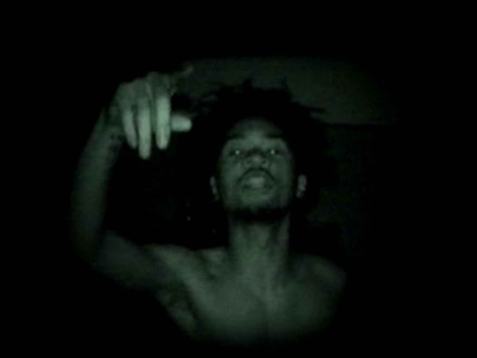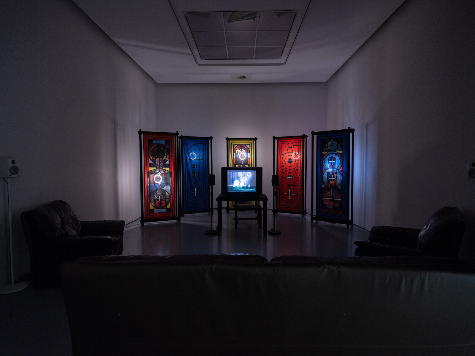 Up the stairs and just outside the gallery doors, we encounter another small cubicle monitor showing a five-minute video. I am Naked—dated 2005 and the earliest work on display—shows Mosquito in a windowless, basement-like space seen through night-vision. Topless, he rants in Patois at the camera—that is, towards the guard who is the viewer—while pacing back and forth: words of anger, resistance, defiance. Manifesting tropes of Black masculinity, including those that precisely fit into the narrow scenario of surveillance and imprisonment, the work foregrounds its own ambivalence. Is it a straightforward evocation of rebellion and struggle for emancipation? Or does it, on the contrary, elicit precisely this expectation—and the viewer’s enjoyment of such performances—to play off content (the rant) against framing (the gaze)?